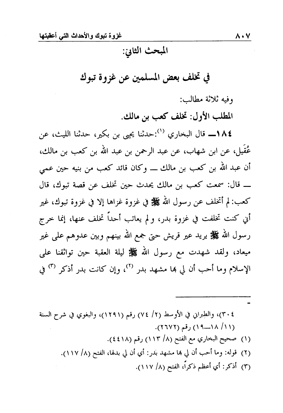 184- قال البخاري1:حدثنا يحيى بن بكير، حدثنا الليث، عن عُقَيل، عن ابن شهاب، عن عبد الرحمن بن عبد الله بن كعب بن مالك، أن عبد الله بن كعب بن مالك - وكان قائد كعب من بنيه حين عمي - قال: سمعت كعب بن مالك يحدث حين تخلف عن قصة تبوك، قال كعب: لم أتخلف عن رسول الله صلى الله عليه وسلم في غزوة غزاها إلا في غزوة تبوك، غير أني كنت تخلفت في غزوة بدر، ولم يعاتب أحداً تخلف عنها، إنما خرج رسول الله صلى الله عليه وسلم يريد عير قريش حتى جمع الله بينهم وبين عدوهم على غير ميعاد، ولقد شهدت مع رسول الله صلى الله عليه وسلم ليلة العقبة حين تواثقنا على الإسلام وما أحب أن لي بها مشهد بدر2، وإن كانت بدر أذكر3 في