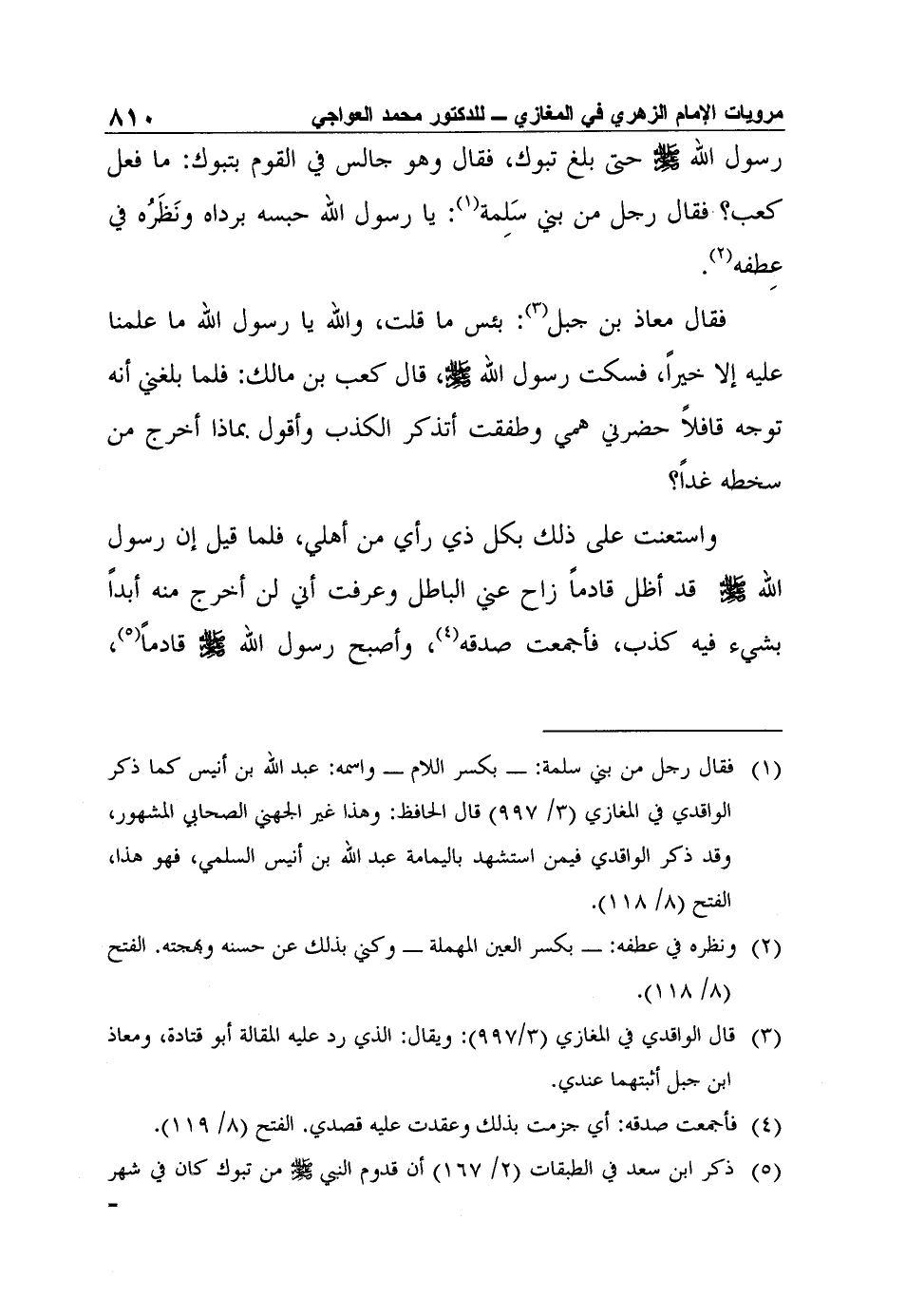 3 قال الواقدي في المغازي (3/997) : "ويقال: الذي رد عليه المقالة أبو قتادة، ومعاذ ابن جبل أثبتهما عندي".