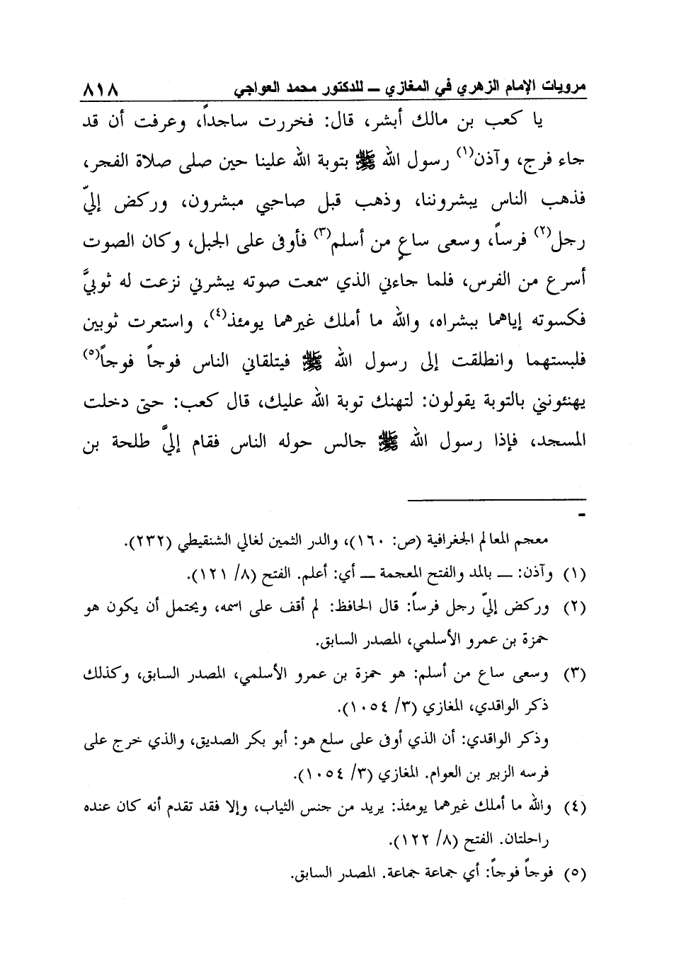 يا كعب بن مالك أبشر، قال: فخررت ساجداً، وعرفت أن قد جاء فرج، وآذن1 رسول الله صلى الله عليه وسلم بتوبة الله علينا حين صلى صلاة الفجر، فذهب الناس يبشروننا، وذهب قبل صاحبي مبشرون، وركض إليّ رجل2 فرساً، وسعى ساعٍ من أسلم3 فأوفى على الجبل، وكان الصوت أسرع من الفرس، فلما جاءني الذي سمعت صوته يبشرني نزعت له ثوبيَّ فكسوته إياهما ببشراه، والله ما أملك غيرهما يومئذ4، واستعرت ثوبين فلبستهما وانطلقت إلى رسول الله صلى الله عليه وسلم فيتلقاني الناس فوجاً فوجاً5 يهنئونني بالتوبة يقولون: لتهنك توبة الله عليك، قال كعب: حتى دخلت المسجد، فإذا رسول الله صلى الله عليه وسلم جالس حوله الناس فقام إليَّ طلحة بن