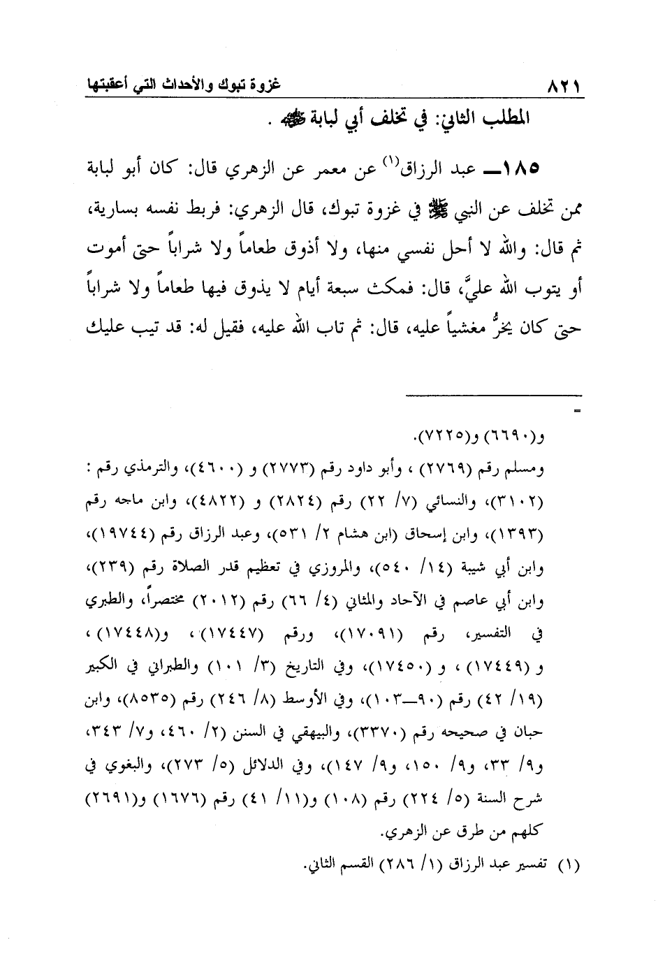185- عبد الرزاق1عن معمر عن الزهري قال: كان أبو لبابة ممن تخلف عن النبي صلى الله عليه وسلم في غزوة تبوك، قال الزهري: فربط نفسه بسارية، ثم قال: والله لا أحل نفسي منها، ولا أذوق طعاماً ولا شراباً حتى أموت أو يتوب الله عليَّ، قال: فمكث سبعة أيام لا يذوق فيها طعاماً ولا شراباً حتى كان يخرُّ مغشياً عليه، قال: ثم تاب الله عليه، فقيل له: قد تيب عليك