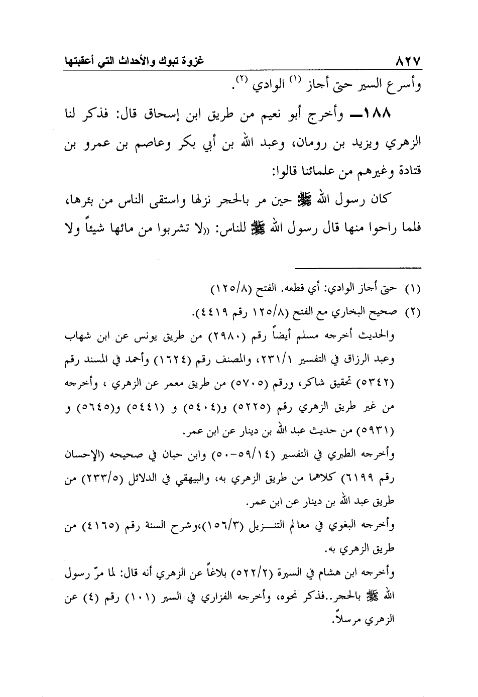 188- وأخرج أبو نعيم من طريق ابن إسحاق قال: فذكر لنا الزهري ويزيد بن رومان، وعبد الله بن أبي بكر وعاصم بن عمرو بن قتادة وغيرهم من علمائنا قالوا: كان رسول الله صلى الله عليه وسلم حين مر بالحجر نزلها واستقى الناس من بئرها، فلما راحوا منها قال رسول الله صلى الله عليه وسلم للناس: "لا تشربوا من مائها شيئاً ولا