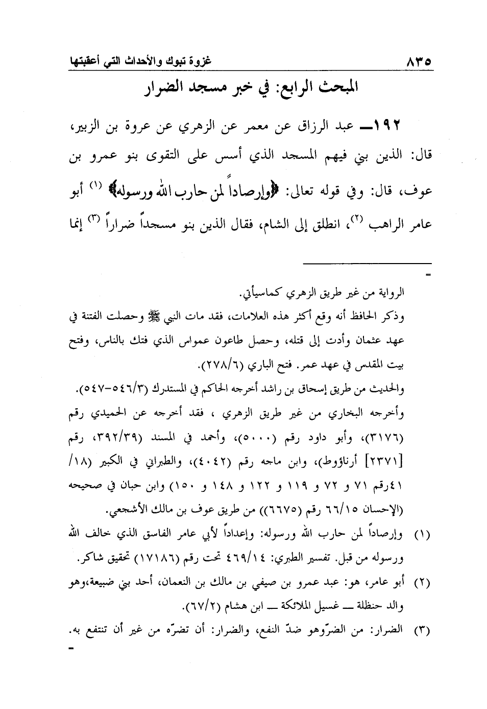 192- عبد الرزاق عن معمر عن الزهري عن عروة بن الزبير، قال: الذين بني فيهم المسجد الذي أسس على التقوى بنو عمرو بن عوف، قال: وفي قوله تعالى: {وَإِرْصَادَاً لِمَنْ حَارَبَ اللَّهَ وَرَسُولَهُ} 1 أبو عامر الراهب2، انطلق إلى الشام، فقال الذين بنو مسجداً ضراراً3 إنما