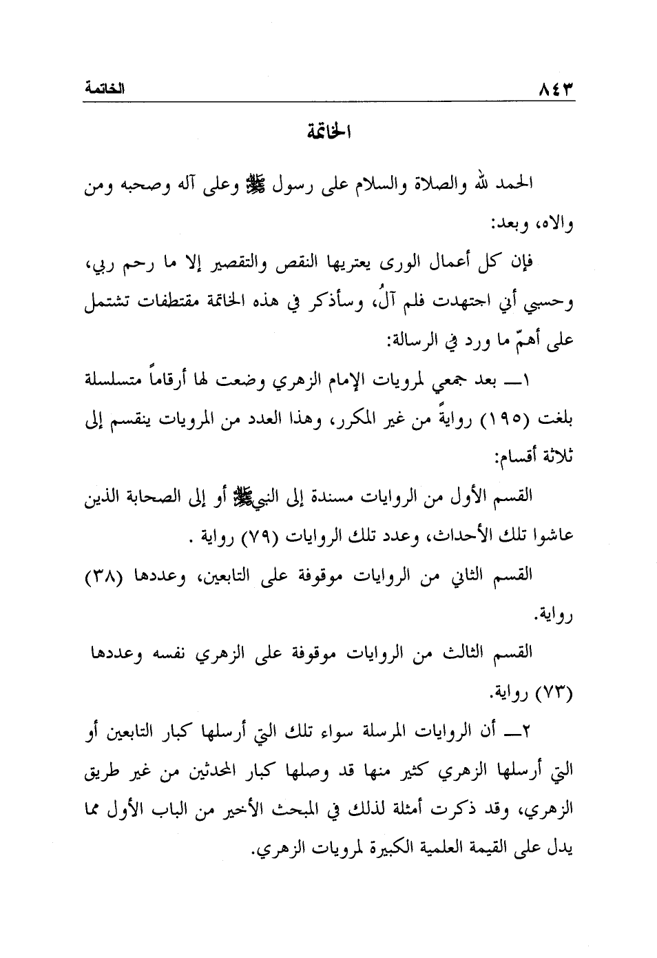 2- أن الروايات المرسلة سواء تلك التي أرسلها كبار التابعين أو التي أرسلها الزهري كثير منها قد وصلها كبار المحدثين من غير طريق الزهري، وقد ذكرت أمثلة لذلك في المبحث الأخير من الباب الأول مما يدل على القيمة العلمية الكبيرة لمرويات الزهري.