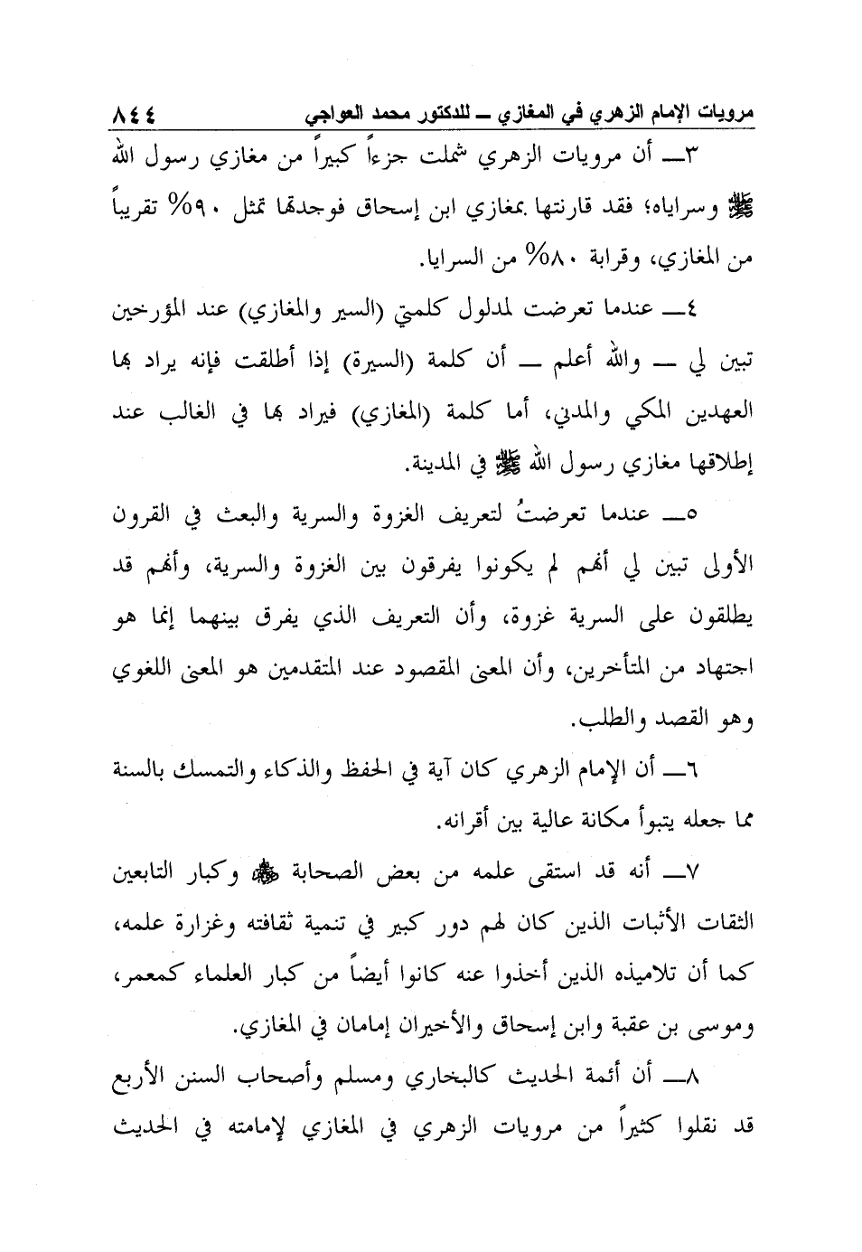 3- أن مرويات الزهري شملت جزءاً كبيراً من مغازي رسول الله صلى الله عليه وسلم وسراياه؛ فقد قارنتها بمغازي ابن إسحاق فوجدتها تمثل 90% تقريباً من المغازي، وقرابة 80% من السرايا.