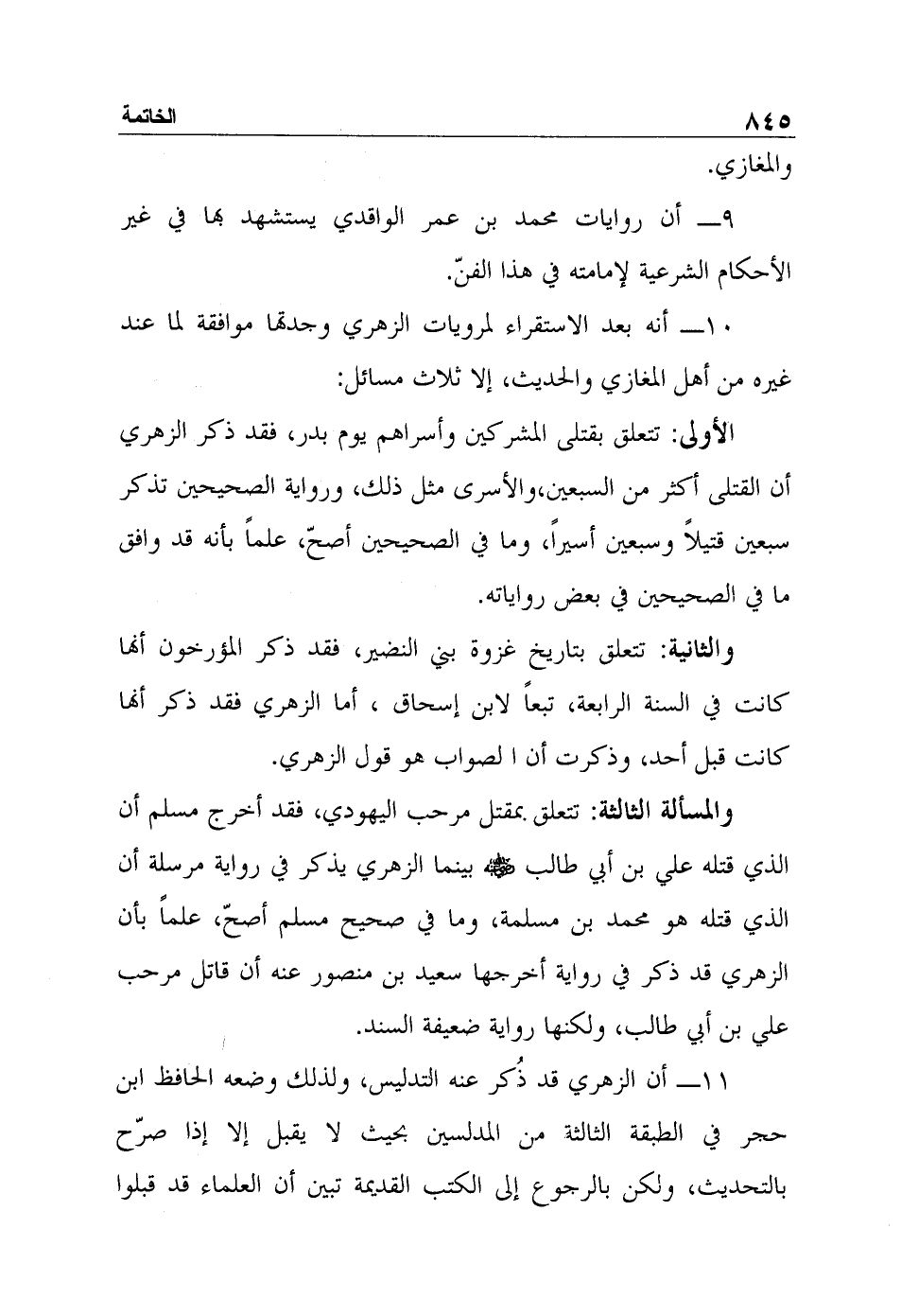 10- أنه بعد الاستقراء لمرويات الزهري وجدتها موافقة لما عند غيره من أهل المغازي والحديث، إلا ثلاث مسائل:
