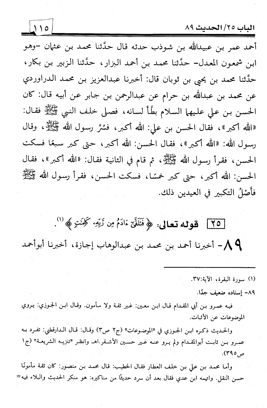 89 - أخبرنا أحمد بن محمد بن عبد الوهاب إجازة، أخبرنا أبو أحمد -[116]- عمر بن عبيد الله بن شوذب، حدثنا محمد بن عثمان قال: حدثني محمد بن سليمان بن الحارث، حدثنا محمد بن علي بن خلف العطار، حدثنا حسين الأشقر، حدثنا عمرو بن أبي المقدام، عن أبيه عن سعيد بن جبير عن عبد الله بن عباس قال: سئل النبي صلى الله عليه وسلم عن الكلمات التي تلقى آدم من ربه فتاب عليه، قال: ((سأله بحق محمد وعلي وفاطمة والحسن والحسين إلا تبت علي فتاب عليه)).