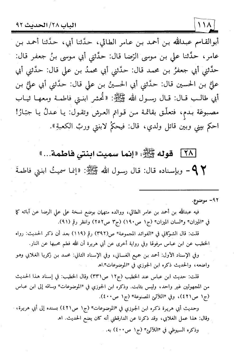 92 - وبإسناده قال: قال رسول الله صلى الله عليه وسلم: ((إنما سميت ابنتي فاطمة -[119]- لأن الله عز وجل فطمها وفطم من أحبها من النار)).