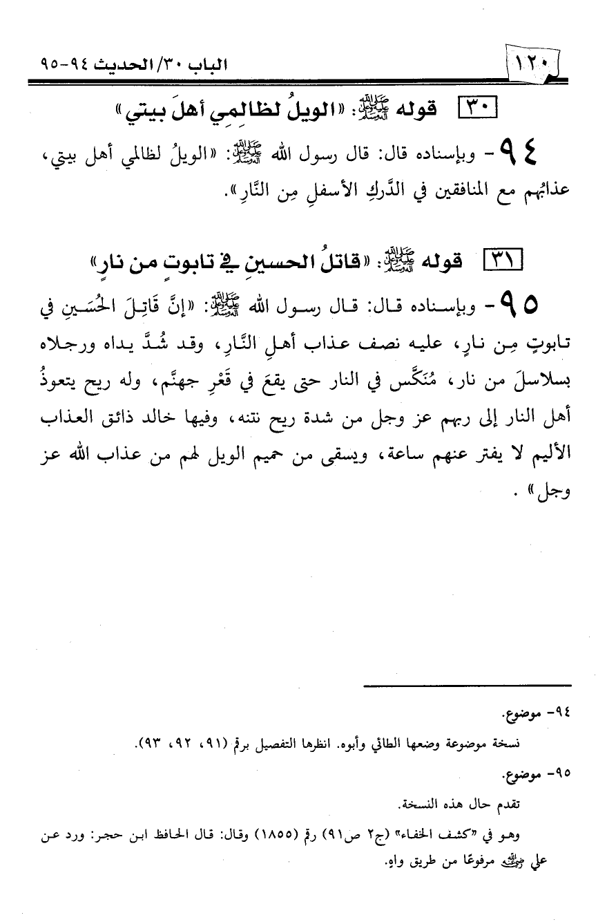 95 - وبإسناده قال: قال رسول الله صلى الله عليه وسلم: ((إن قاتل الحسين في تابوت من نارٍ، عليه نصف عذاب أهل النار، وقد شد يداه ورجلاه بسلاسل من نار، منكس في النار حتى يقع في قعر جهنم، وله ريح يتعوذ أهل النار إلى ربهم عز وجل من شدة ريح نتنه، وفيها خالد ذائق العذاب الأليم لا يفتر عنهم ساعة، ويسقى من حميم الويل لهم من عذاب الله عز وجل)).