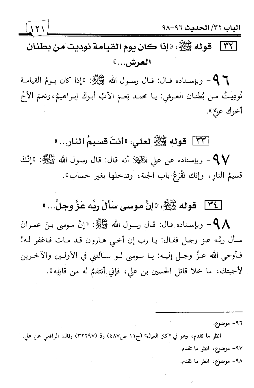 97 - وبإسناده عن علي عليه السلام أنه قال: قال رسول الله صلى الله عليه وسلم: ((أنت قسيم النار، وإنك تقرع باب الجنة، وتدخلها بغير حساب)).