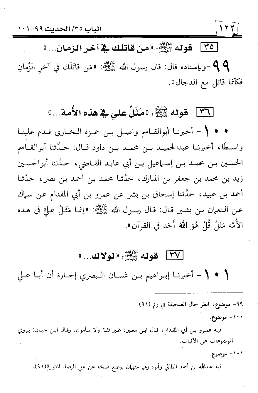 100 - أخبرنا أبو القاسم واصل بن حمزة البخاري قدم علينا واسطاً، أخبرنا عبد الحميد بن محمد بن داود قال: حدثنا أبو القاسم الحسين بن محمد بن إسماعيل بن أبي عابد القاضي، حدثنا أبو الحسين زيد بن محمد بن جعفر بن المبارك، حدثنا محمد بن أحمد بن نصر، حدثنا أحمد بن عبيد، حدثنا إسحاق بن بشر عن عمرو بن أبي المقدام عن سماك عن النعمان بن بشير قال: قال رسول الله صلى الله عليه وسلم: ((إنما مثل علي في هذه الأمة مثل قل هو الله أحد في القرآن)).