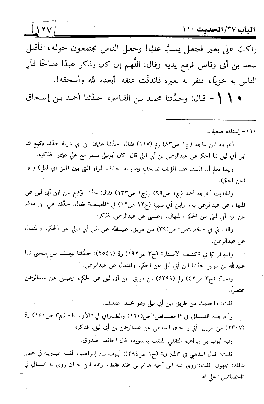 110 - قال: وحدثنا محمد بن القاسم، حدثنا أحمد بن إسحاق -[128]- الوراق، حدثنا عثمان بن أبي شيبة، حدثنا وكيع عن أبي ليلى، وعن الحكم عن عبد الرحمن بن أبي ليلى عن أبي ليلى أنه كان يسير مع علي عليه السلام فيراه يلبس لباس الشتاء في الصيف، ولباس الصيف في الشتاء، فسألته عن ذلك، فقال: طلبني رسول الله صلى الله عليه وسلم يوم خيبر فجئت وأنا أرمد فبصق في عيني فبرأت، وقال: ((اللهم قه الحر والبرد))، فما وجدت بعد ذلك حراً ولا برداً.