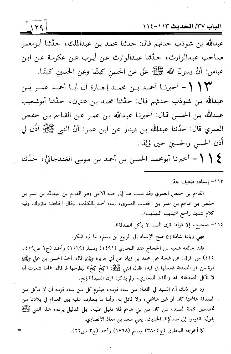113 - أخبرنا أحمد بن محمد إجازة أن أبا أحمد عمر بن عبد الله بن شوذب حدثهم قال: حدثنا محمد بن عثمان، حدثنا أبو شعيب عبد الله بن الحسن قال: أخبرنا عبد الله بن عمر عن القاسم بن حفص العمري قال: حدثنا عبد الله بن دينار عن ابن عمر: أن النبي صلى الله عليه وسلم أذن في أذن الحسن والحسين حين ولدا.