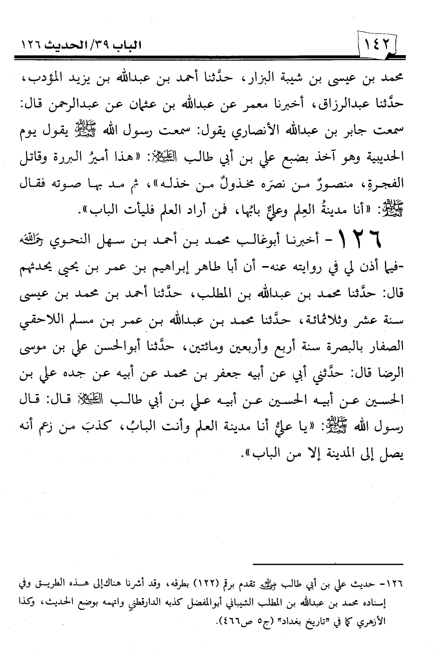 126 - أخبرنا أبو غالب محمد بن أحمد بن سهل النحوي رحمه الله -فيما أذن لي في روايته عنه- أن أبا طاهر إبراهيم بن عمر بن يحيى يحدثهم قال: حدثنا محمد بن عبد الله بن المطلب، حدثنا أحمد بن محمد بن عيسى سنة عشر وثلاثمائة، حدثنا محمد بن عبد الله بن عمر بن مسلم اللاحقي الصفار بالبصرة سنة أربع وأربعين ومائتين، حدثنا أبو الحسن علي بن موسى الرضا قال: حدثني أبي عن أبيه جعفر بن محمد عن أبيه عن جده علي بن الحسين عن أبيه الحسين عن أبيه علي بن أبي طالب عليه السلام قال: قال رسول الله صلى الله عليه وسلم: ((يا علي أنا مدينة العلم وأنت الباب، كذب من زعم أنه يصل إلى المدينة إلا من الباب)).