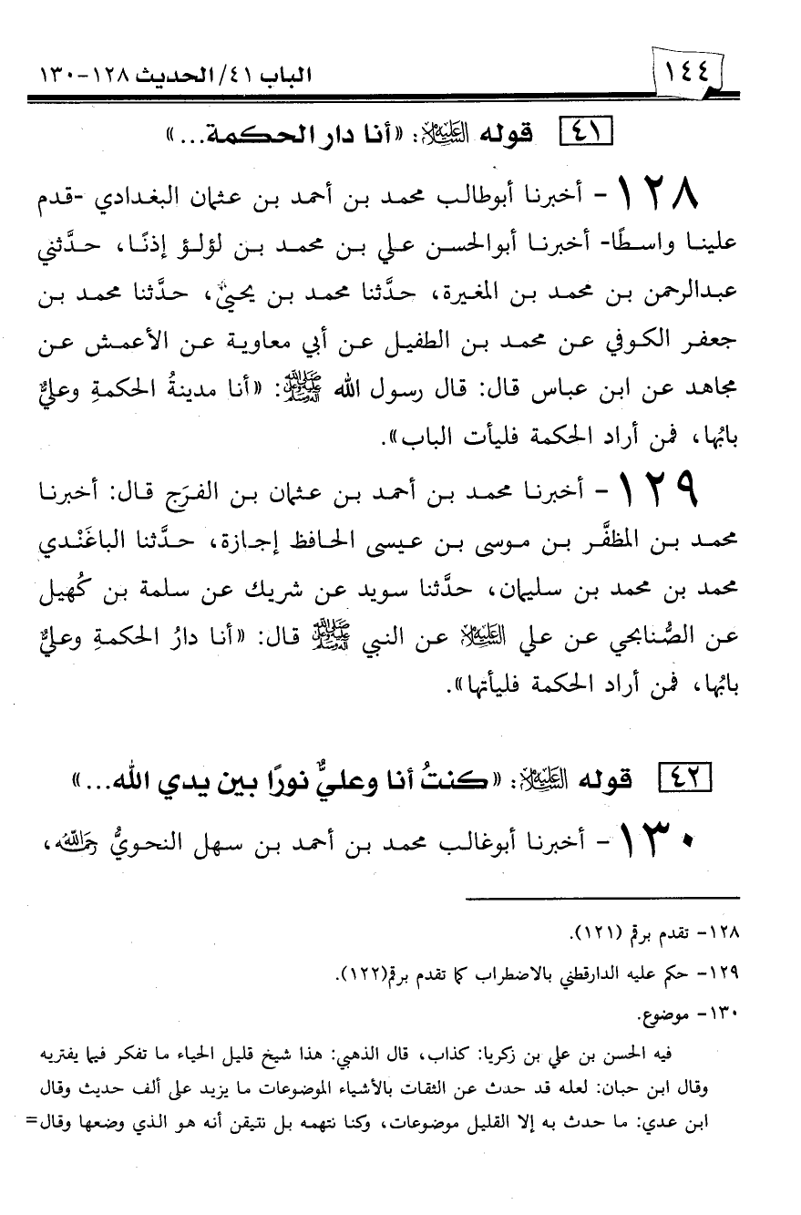 128 - أخبرنا أبو طالب محمد بن أحمد بن عثمان البغدادي -قدم علينا واسطاً- أخبرنا أبو الحسن علي بن محمد بن لؤلؤ إذناً، حدثني عبد الرحمن بن محمد بن المغيرة، حدثنا محمد بن يحيى، حدثنا محمد بن جعفر الكوفي عن محمد بن الطفيل عن أبي معاوية عن الأعمش عن مجاهد عن ابن عباس قال: قال رسول الله صلى الله عليه وسلم: ((أنا مدينة الحكمة وعلي بابها، فمن أراد الحكمة فليأت الباب)).
