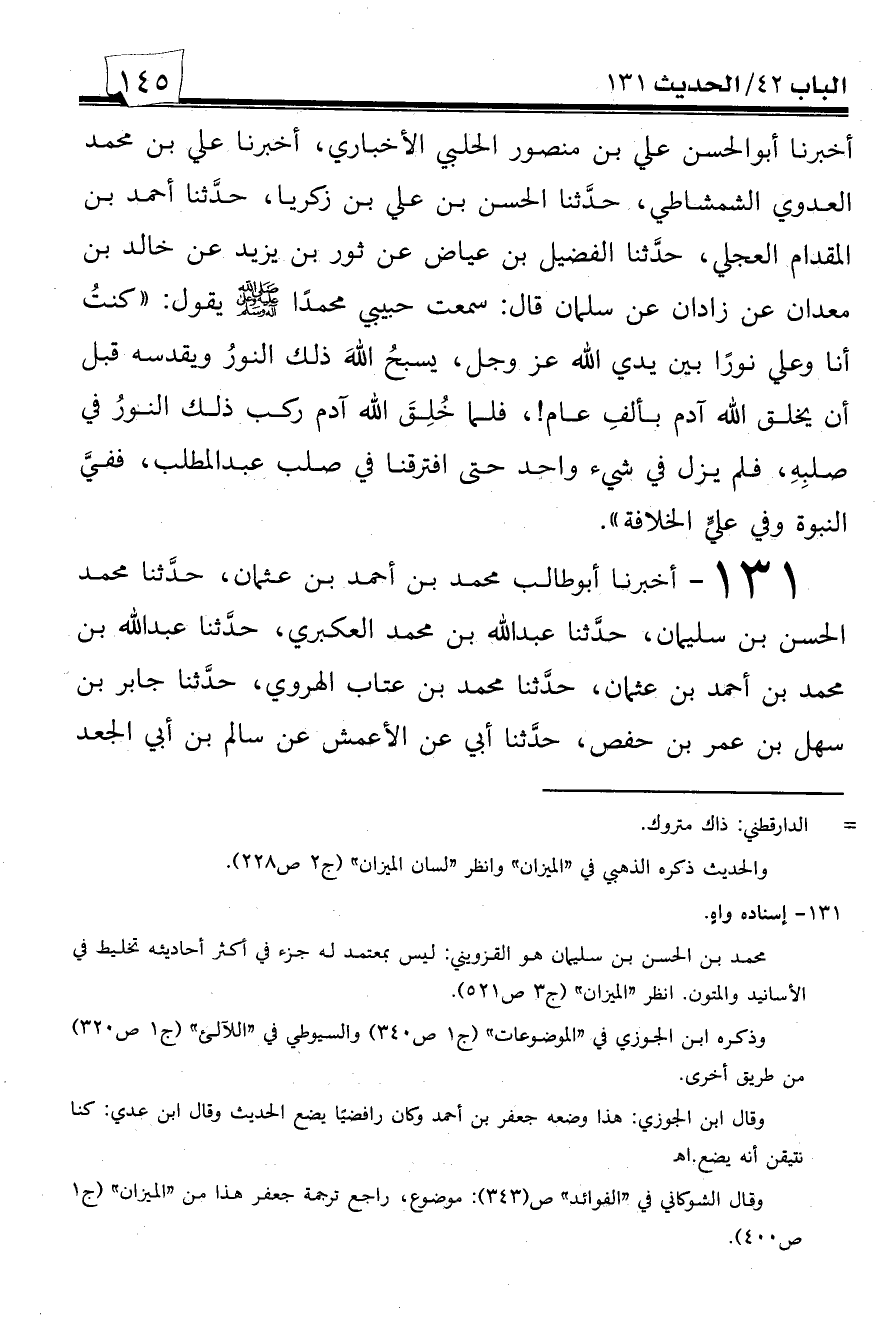 131 - أخبرنا أبو طالب محمد بن أحمد بن عثمان، حدثنا محمد الحسن بن سليمان، حدثنا عبد الله بن محمد العكبري، حدثنا عبد الله بن محمد بن أحمد بن عثمان، حدثنا محمد بن عتاب الهروي، حدثنا جابر بن سهل بن عمر بن حفص، حدثنا أبي عن الأعمش عن سالم بن أبي الجعد -[146]- عن أبي ذر قال: سمعت رسول الله صلى الله عليه وسلم يقول: ((كنت أنا وعلي نوراً عن يمين العرش يسبح الله ذلك النور ويقدسه قبل أن يخلق الله آدم بأربعة عشر ألف عام، فلم أزل أنا وعلي في شيء واحد حتى افترقنا في صلب عبد المطلب)).