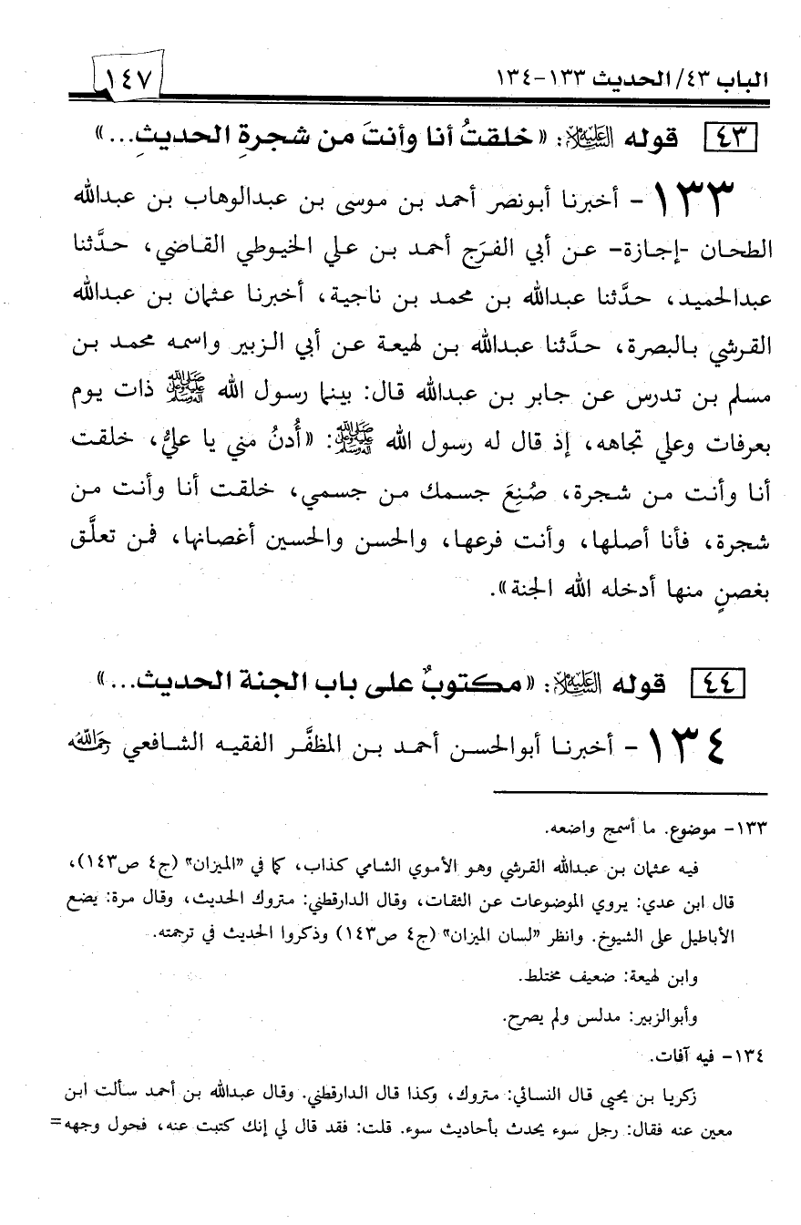 133 - أخبرنا أبو نصر أحمد بن موسى بن عبد الوهاب بن عبد الله الطحان -إجازة- عن أبي الفرج أحمد بن علي الخيوطي القاضي، حدثنا عبد الحميد، حدثنا عبد الله بن محمد بن ناجية، أخبرنا عثمان بن عبد الله القرشي بالبصرة، حدثنا عبد الله بن لهيعة عن أبي الزبير واسمه محمد بن مسلم بن تدرس عن جابر بن عبد الله قال: بينما رسول الله صلى الله عليه وسلم ذات يوم بعرفات وعلي تجاهه، إذ قال له رسول الله صلى الله عليه وسلم: ((ادن مني يا علي، خلقت أنا وأنت من شجرة، صنع جسمك من جسمي، خلقت أنا وأنت من شجرة، فأنا أصلها، وأنت فرعها، والحسن والحسين أغصانها، فمن تعلق بغصنٍ منها أدخله الله الجنة)).