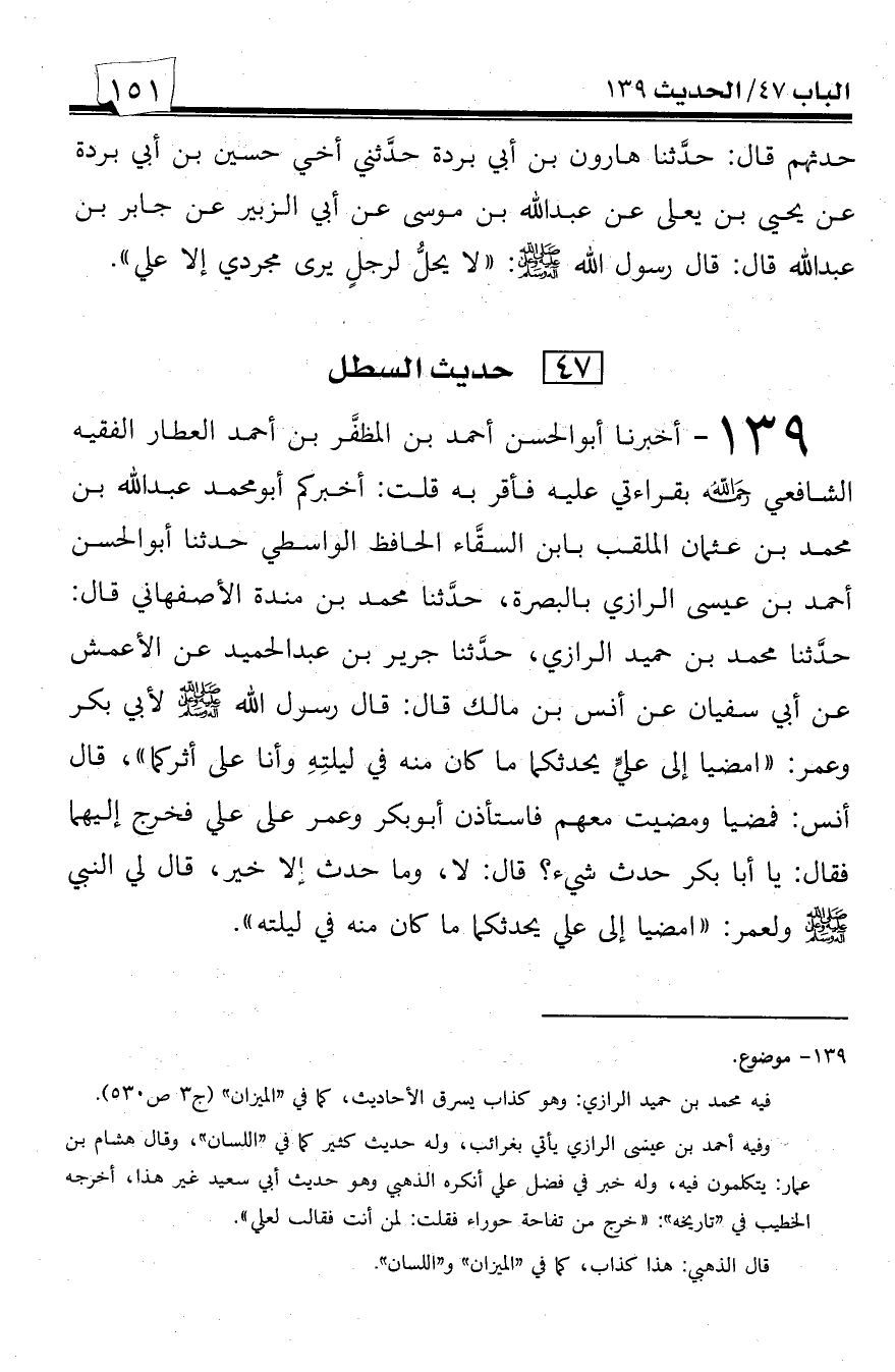 139 - أخبرنا أبو الحسن أحمد بن المظفر بن أحمد العطار الفقيه الشافعي رحمه الله بقراءتي عليه فأقر به قلت: أخبركم أبو محمد عبد الله بن محمد بن عثمان الملقب بابن السقاء الحافظ الواسطي حدثنا أبو الحسن أحمد بن عيسى الرازي بالبصرة، حدثنا محمد بن مندة الأصفهاني قال: حدثنا محمد بن حميد الرازي، حدثنا جرير بن عبد الحميد عن الأعمش عن أبي سفيان عن أنس بن مالك قال: قال رسول الله صلى الله عليه وسلم لأبي بكر وعمر: ((امضيا إلى علي يحدثكما ما كان منه في ليلته وأنا على أثركما))، قال أنس: فمضيا ومضيت معهم فاستأذن أبو بكر وعمر على علي فخرج إليهما فقال: يا أبا بكر حدث شيء؟ قال: لا، وما حدث إلا خير، قال لي النبي صلى الله عليه وسلم ولعمر: ((امضيا إلى علي يحدثكما ما كان منه في ليلته)). -[152]- وجاء النبي صلى الله عليه وسلم وقال: ((يا علي حدثهما ما كان منك في ليلتك))، فقال: أستحي يا رسول الله! فقال: ((حدثهما إن الله لا يستحي من الحق)) فقال علي: أردت الماء للطهارة وأصبحت وخفت أن تفوتني الصلاة، فوجهت الحسن في طريق والحسين في طريق في طلب الماء، فأبطآ علي فأحزنني ذلك، فرأيت السقف قد انشق ونزل علي منه سطل مغطى بمنديل! فلما صار في الأرض نحيت المنديل عنه، وإذا فيه ماء فتطهرت للصلاة، واغتسلت، وصليت، ثم ارتفع السطل والمنديل، والتأم السقف، فقال النبي صلى الله عليه وسلم لعلي: ((أما السطل فمن الجنة، وأما الماء فمن نهر الكوثر، وأما المنديل فمن استبرق الجنة، من مثلك يا علي في ليلته وجبريل يخدمه)).