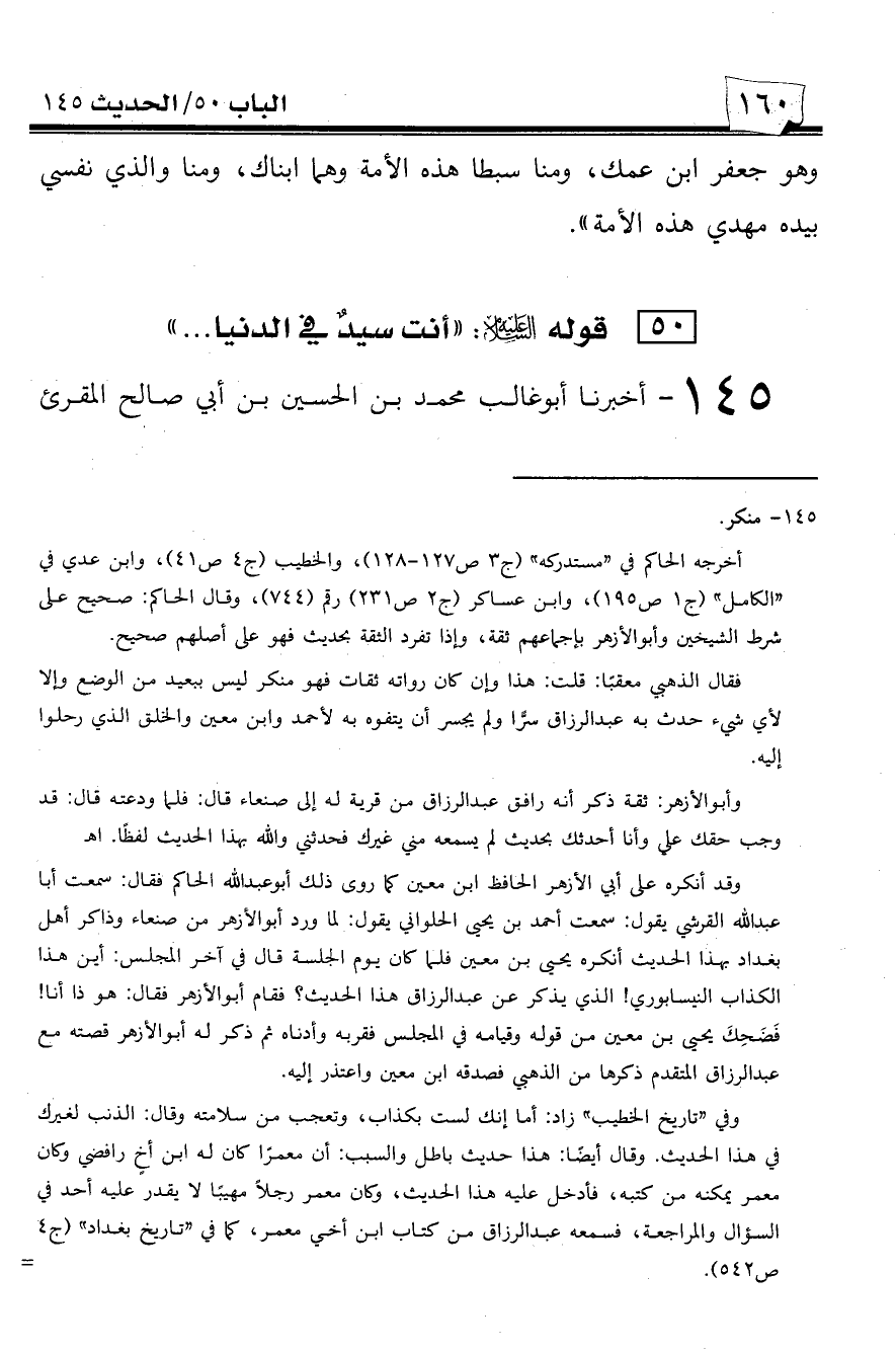 145 - أخبرنا أبو غالب محمد بن الحسين بن أبي صالح المقرئ -[161]- وأبو غالب الحسن بن أحمد بن إبراهيم بن اللكاف الواسطيان قالا: أخبرنا أبو نصر أحمد بن سهل بن مردويه البزار، حدثنا أحمد بن عيسى الناقد، حدثنا إبراهيم بن محمد، حدثنا أبو الأزهر: أحمد بن الأزهر، حدثنا عبد الرزاق، أخبرنا معمر عن الزهري عن عبيد الله بن عبد الله عن ابن عباس قال: نظر النبي صلى الله عليه وسلم إلى علي بن أبي طالب فقال: ((أنت سيدٌ في الدنيا وسيدٌ في الآخرة، من أحبك فقد أحبني، وحبيبي حبيب الله، وعدوك عدوي، وعدوي عدو الله عز وجل، ويل لمن أبغضك من بعدي)).