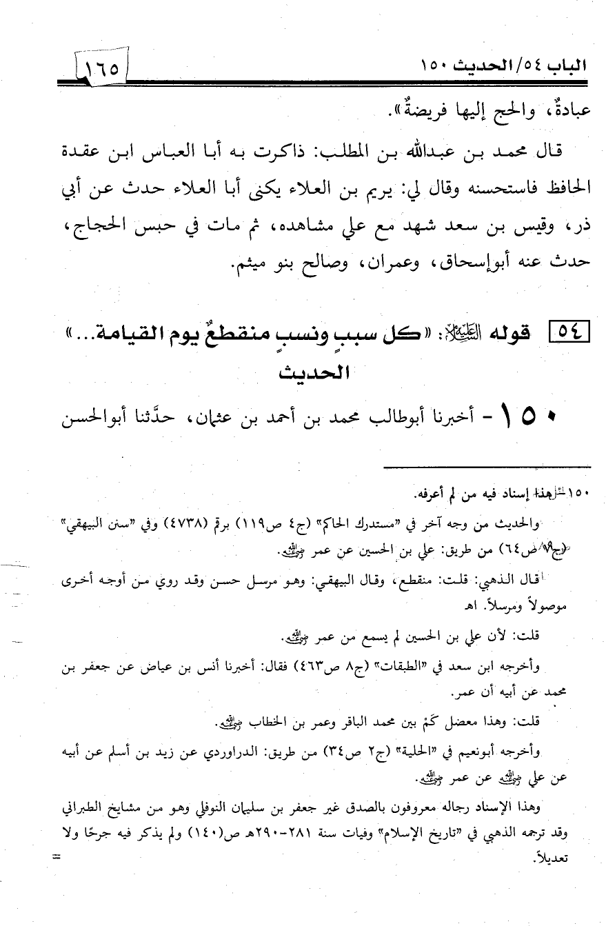 150 - أخبرنا أبو طالب محمد بن أحمد بن عثمان، حدثنا أبو الحسن -[166]- علي بن محمد بن لؤلؤ إذناً، أخبرنا الحسن بن أحمد بن سعيد السلمي، حدثنا الحسن بن هاشم الحراني، حدثنا محمد بن طلحة الحجبي، حدثنا عبيد الله بن عمرو عن زيد بن أبي أنيسة عن المنهال بن عمرو عن سعيد بن جبير عن ابن عباس عن عمر بن الخطاب قال: قال النبي صلى الله عليه وسلم: ((كل سببٍ ونسبٍ منقطع يوم القيامة إلا ما كان من سببي ونسبي)).