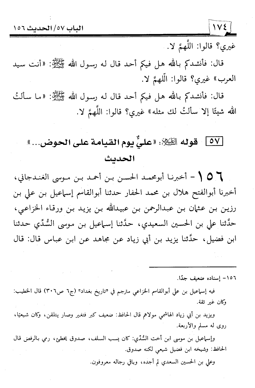 156 - أخبرنا أبو محمد الحسن بن أحمد بن موسى الغندجاني، أخبرنا أبو الفتح هلال بن محمد الحفار حدثنا أبو القاسم إسماعيل بن علي بن رزين بن عثمان بن عبد الرحمن بن عبيد الله بن يزيد بن ورقاء الخزاعي، حدثنا علي بن الحسين السعيدي، حدثنا إسماعيل بن موسى السدي حدثنا ابن فضيل، حدثنا يزيد بن أبي زياد عن مجاهد عن ابن عباس قال: قال -[175]- رسول الله صلى الله عليه وسلم: ((علي يوم القيامة على الحوض، لا يدخل الجنة إلا من جاء بجواز من علي بن أبي طالب عليه السلام)).