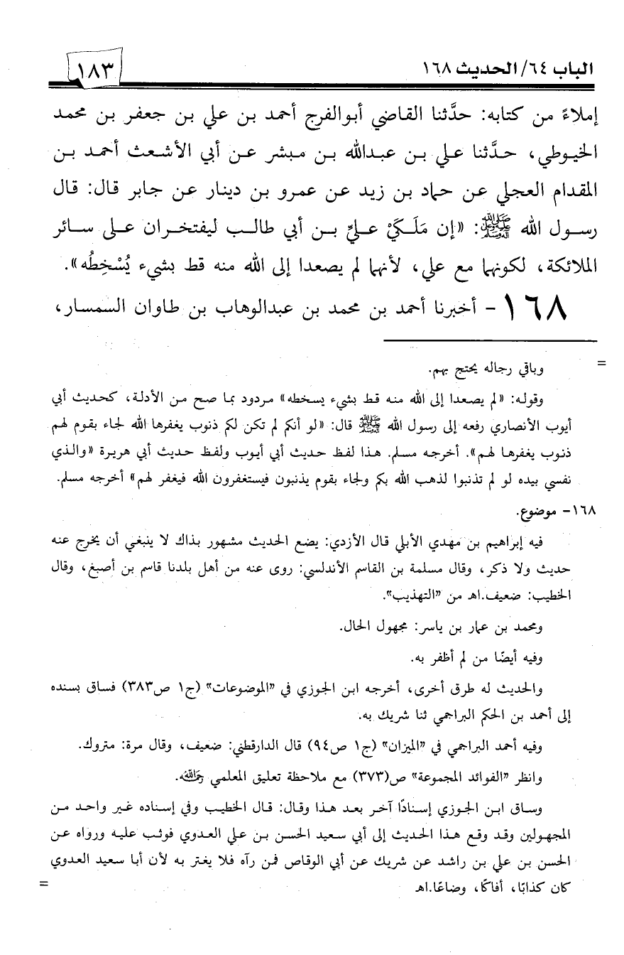 168 - أخبرنا أحمد بن محمد بن عبد الوهاب بن طاوان السمسار، -[184]- أخبرنا أبو عبد الله الحسين بن محمد العلوي العدل، حدثنا محمد بن محمود، حدثنا إبراهيم بن مهدي الأبلي، حدثنا معاذ بن شعبة، حدثنا شريك عن أبي الوقاص العامري عن محمد بن عمار بن ياسر عن أبيه قال: قال رسول الله صلى الله عليه وسلم: ((إن حفظتي علي يفتخران على الحفظة بكينونتهما معه، وذلك أنهما لم يصعدا له إلى الله تبارك وتعالى بشيء يسخطه)).