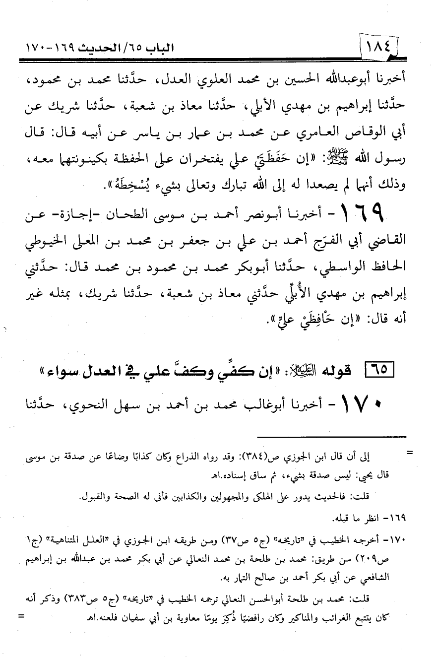169 - أخبرنا أبو نصر أحمد بن موسى الطحان -إجازة- عن القاضي أبي الفرج أحمد بن علي بن جعفر بن محمد بن المعلى الخيوطي الحافظ الواسطي، حدثنا أبو بكر محمد بن محمود بن محمد قال: حدثني إبراهيم بن مهدي الأبلي حدثني معاذ بن شعبة، حدثنا شريك، بمثله غير أنه قال: ((إن حافظي علي)).