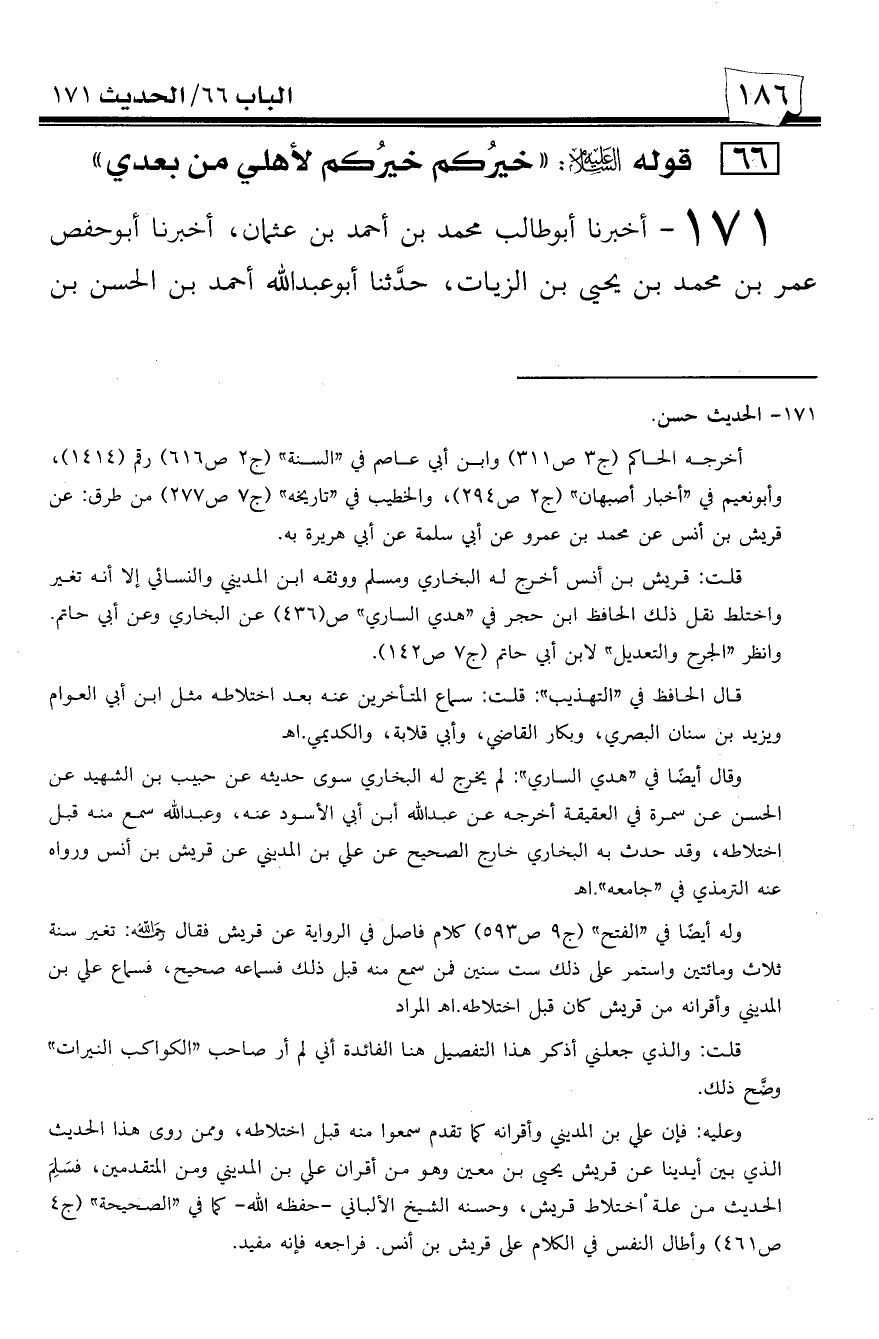 171 - أخبرنا أبو طالب محمد بن أحمد بن عثمان، أخبرنا أبو حفص عمر بن محمد بن يحيى بن الزيات، حدثنا أبو عبد الله أحمد بن الحسن بن -[187]- عبد الجبار، حدثنا يحيى بن معين أبو زكريا، حدثنا قريش بن أنس عن محمد بن عمرو عن أبي سلمة عن أبي هريرة قال: قال رسول الله صلى الله عليه وسلم ((خيركم خيركم لأهلي من بعده)).
