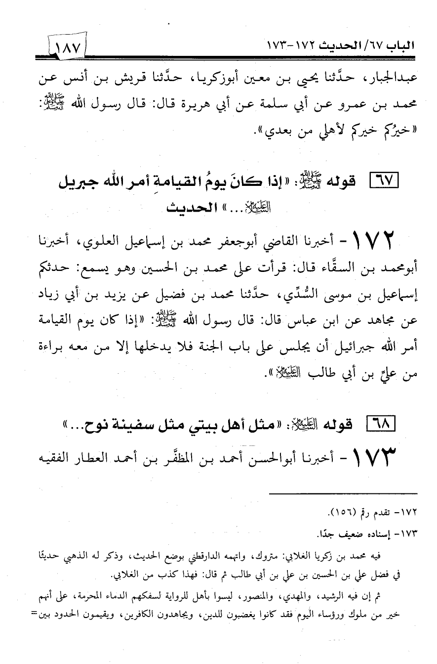 172 - أخبرنا القاضي أبو جعفر محمد بن إسماعيل العلوي، أخبرنا أبو محمد بن السقاء قال: قرأت على محمد بن الحسين وهو يسمع: حدثكم إسماعيل بن موسى السدي، حدثنا محمد بن فضيل عن يزيد بن أبي زياد عن مجاهد عن ابن عباس قال: قال رسول الله صلى الله عليه وسلم: ((إذا كان يوم القيامة أمر الله جبرائيل أن يجلس على باب الجنة فلا يدخلها إلا من معه براءة من علي بن أبي طالب عليه السلام)).