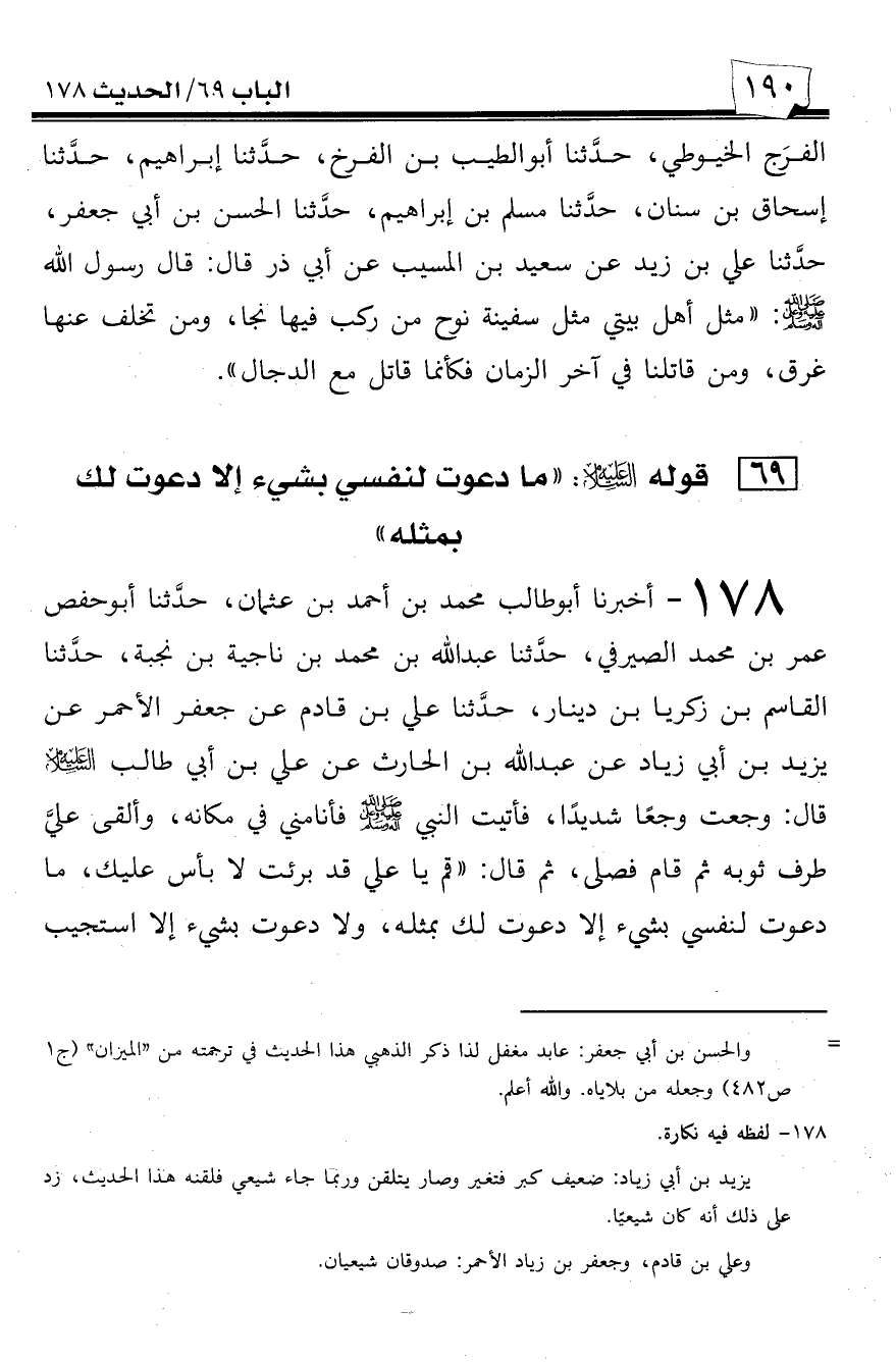 178 - أخبرنا أبو طالب محمد بن أحمد بن عثمان، حدثنا أبو حفص عمر بن محمد الصيرفي، حدثنا عبد الله بن محمد بن ناجية بن نجبة، حدثنا القاسم بن زكريا بن دينار، حدثنا علي بن قادم عن جعفر الأحمر عن يزيد بن أبي زياد عن عبد الله بن الحارث عن علي بن أبي طالب عليه السلام قال: وجعة وجعاً شديداً، فأتيت النبي صلى الله عليه وسلم فأنامني في مكانه، وألقى علي طرف ثوبه ثم قام فصلى، ثم قال: ((قم يا علي قد برئت لا بأس عليك، ما دعوت لنفسي بشيء إلا دعوت لك بمثله، ولا دعوت بشيء إلا استجيب -[191]- لي، أو قيل: قد أعطيته، إلا أنه لا نبي بعدي)).