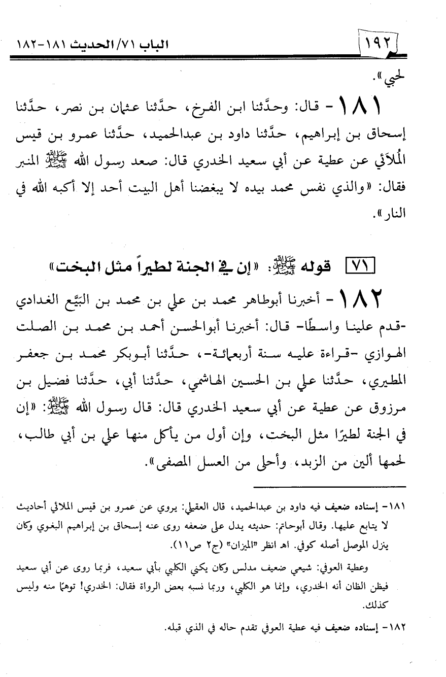 181 - قال: وحدثنا ابن الفرخ، حدثنا عثمان بن نصر، حدثنا إسحاق بن إبراهيم، حدثنا داود بن عبد الحميد، حدثنا عمرو بن قيس الملائي عن عطية عن أبي سعيد الخدري قال: صعد رسول الله صلى الله عليه وسلم المنبر فقال: ((والذي نفس محمد بيده لا يبغضنا أهل البيت أحد إلا أكبه الله في النار)).