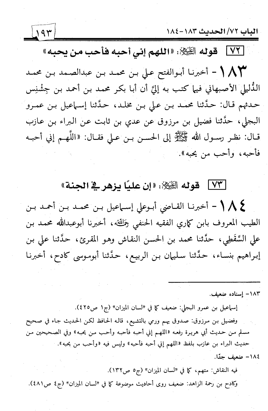 183 - أخبرنا أبو الفتح علي بن محمد بن عبد الصمد بن محمد الدليلي الأصبهاني فيما كتب به إلي أن أبا بكر محمد بن أحمد بن جشنس حدثهم قال: حدثنا محمد بن علي بن مخلد، حدثنا إسماعيل بن عمرو البجلي، حدثنا فضيل بن مرزوق عن عدي بن ثابت عن البراء بن عازب قال: نظر رسول الله صلى الله عليه وسلم إلى الحسن بن علي فقال: ((اللهم إني أحبه فأحبه، وأحب من يحبه)).