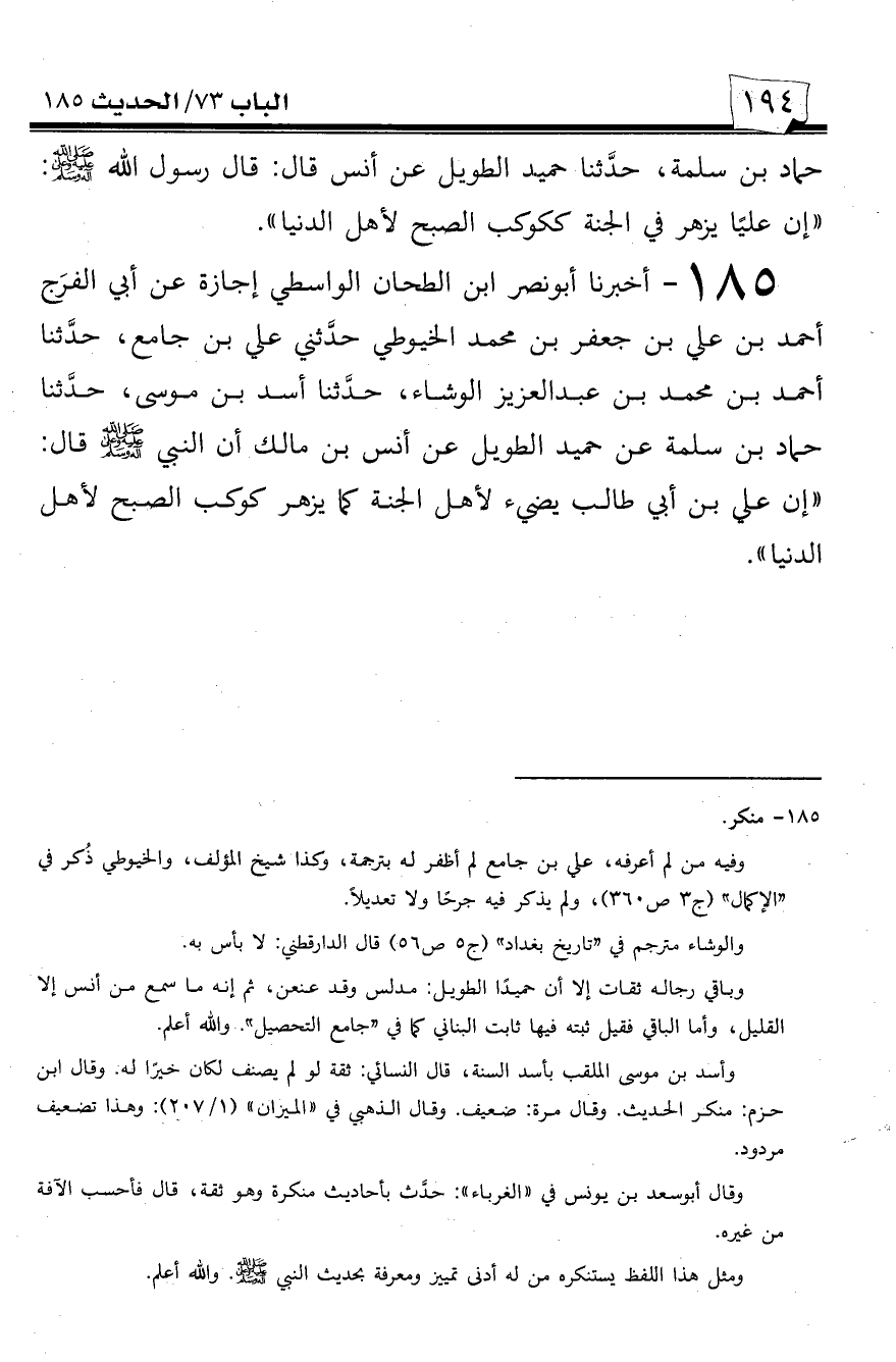 185 - أخبرنا أبو نصر ابن الطحان الواسطي إجازة عن أبي الفرج أحمد بن علي بن جعفر بن محمد الخيوطي حدثني علي بن جامع، حدثنا أحمد بن محمد بن عبد العزيز الوشاء، حدثنا أسد بن موسى، حدثنا حماد بن سلمة عن حميد الطويل عن أنس بن مالك أن النبي صلى الله عليه وسلم قال: ((إن علي بن أبي طالب يضيء لأهل الجنة كما يزهر كوكب الصبح لأهل الدنيا)).