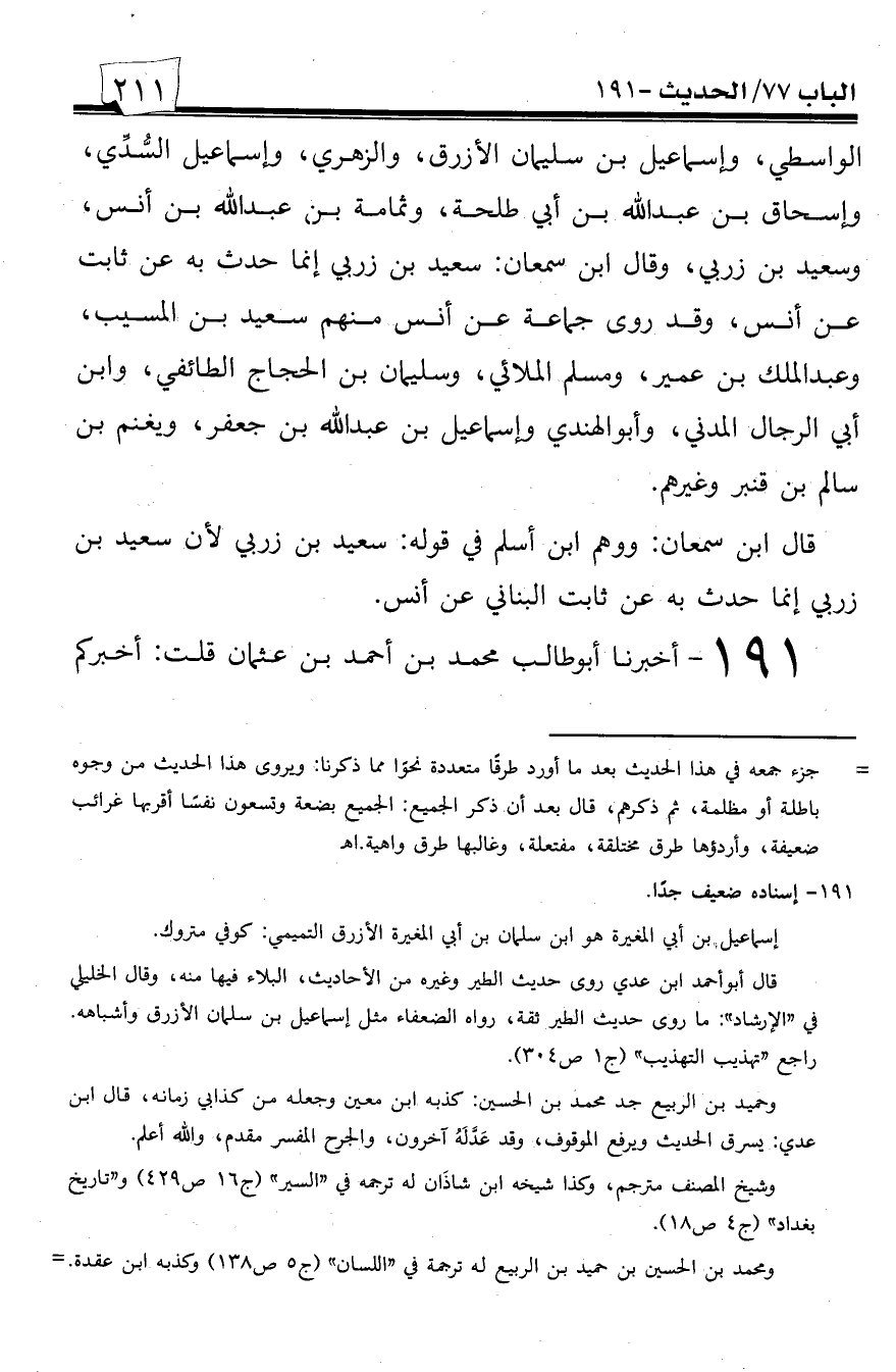 191 - أخبرنا أبو طالب محمد بن أحمد بن عثمان قلت: أخبركم -[212]- أبو بكر أحمد بن إبراهيم بن الحسن بن شاذان البزار البغدادي -إذناً- أن محمد بن الحسين بن حميد بن الربيع حدثهم قال: حدثنا جدي، حدثنا عبيد الله بن موسى، حدثنا إسماعيل بن أبي المغيرة عن أنس بن مالك قال: أهدي لرسول الله صلى الله عليه وسلم أطيار فقسمها بين نسائه فأصاب كل امرأة منهن ثلاثة، فأصبح عند بعض نسائه قطاتان فبعثت بهما إلى النبي صلى الله عليه وسلم فقال: ((اللهم ائتني بأحب خلقك إليك وإلى رسولك يأكل معي من هذا الطعام)) فقلت: اللهم اجعله رجلاً من الأنصار، فجاء علي فقال رسول الله صلى الله عليه وسلم: ((انظر من على الباب)) فنظرت فإذا علي، فقلت له: رسول الله على حاجة. ثم جئت فقمت بين يدي رسول الله فجاء علي فقال صلى الله عليه وسلم: ((يا أنس انظر من على الباب؟)) فنظرت فإذا علي، حتى فعل ذلك ثلاثاً ففتحت له فدخل يمشي وأنا خلفه، فقال له رسول الله صلى الله عليه وسلم: ((ما حبسك؟)) فقال: هذا آخر ثلاث مرات يردني أنس يزعم أنك على حاجة، فقال رسول الله صلى الله عليه وسلم: ((ما حملك على ما صنعت؟)) قلت: يا رسول الله سمعت دعاءك فأحببت أن -[213]- يكون رجلاً من قومي. فقال رسول الله صلى الله عليه وسلم: ((إن الرجل قد يحب قومه، إن الرجل قد يحب قومه، إن الرجل قد يحب قومه)).