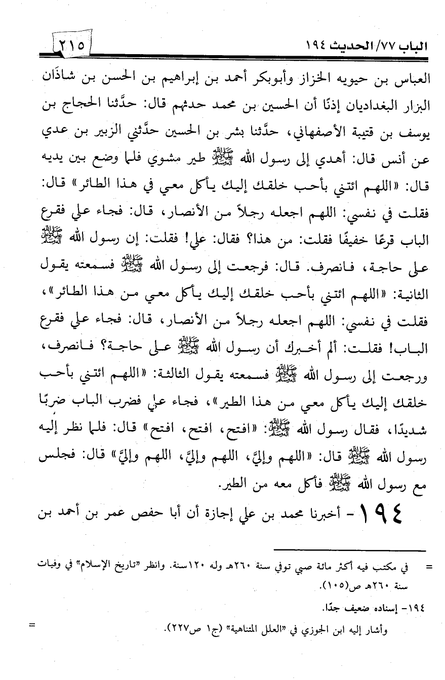194 - أخبرنا محمد بن علي إجازة أن أبا حفص عمر بن أحمد بن -[216]- شاهين الواعظ حدثهم قال: حدثنا محمد بن الحسين الجواربي، حدثنا إبراهيم بن صدقة، حدثنا يغنم بن سالم، حدثنا أنس قال: أهدي لرسول الله صلى الله عليه وسلم طائر ... وذكر الحديث.