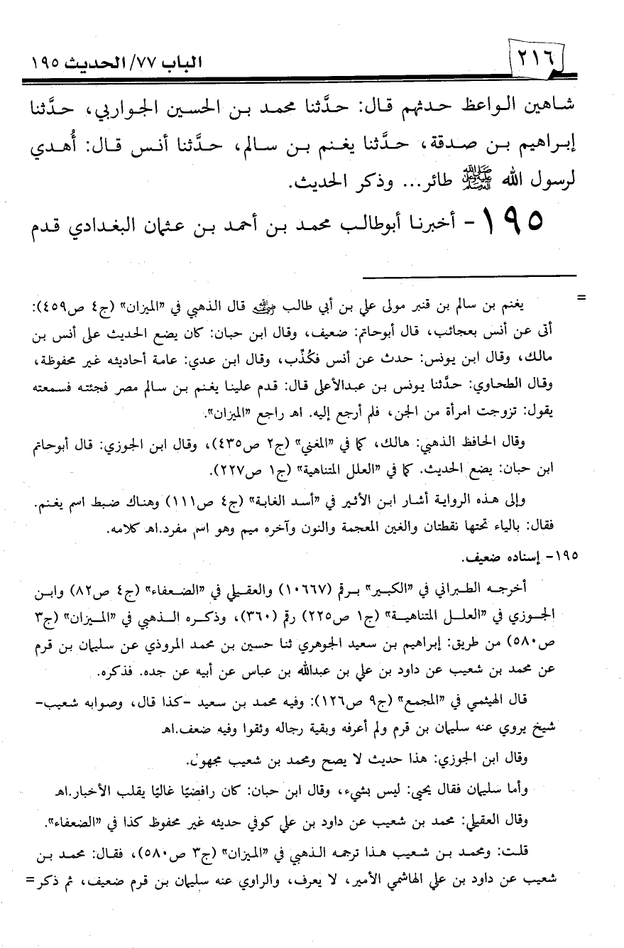 195 - أخبرنا أبو طالب محمد بن أحمد بن عثمان البغدادي قدم -[217]- علينا واسطاً -بقراءتي عليه فأقر به- قلت له: أخبركم عمر بن أحمد بن شاهين أبو حفص إذناً، حدثنا يحيى بن محمد بن صاعد، حدثنا إبراهيم بن سعيد الجوهري، حدثنا حسين بن محمد، حدثنا سليمان بن قرم عن محمد بن شعيب عن داود بن علي بن عبد الله بن عباس عن أبيه عن جده: ابن عباس قال: أتي النبي صلى الله عليه وسلم بطائر فقال: ((اللهم ائتني برجل يحبه الله ورسوله))، فجاء علي فقال: ((اللهم وإلي)). هذا حديث غريب تفرد به حسين المروزي عن سليمان بن قرم ولم يحدث به إلا إبراهيم بن سعيد.