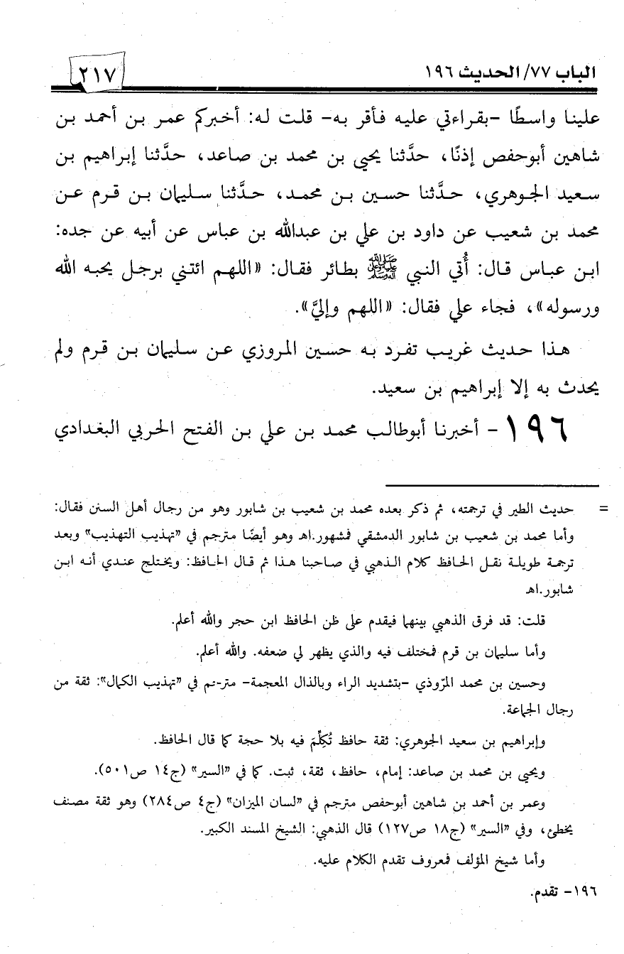 196 - أخبرنا أبو طالب محمد بن علي بن الفتح الحربي البغدادي -[218]- فيما كتب به إلي أن أبا حفص عمر بن أحمد بن شاهين حدثهم قال: حدثنا نصر بن القاسم الفرضي، حدثنا عيسى بن مساور الجوهري قال: قال لي يغنم بن سالم بن قنبر -ولقيته سنة تسعين ومائة وقال يغنم بن سالم: لي اثني عشر ومائة سنة-: قال لي أنس بن مالك: أهدي إلى رسول الله صلى الله عليه وسلم طير مشوي فقال رسول الله صلى الله عليه وسلم: ((اللهم ائتني بأحب خلقك إليك -أو بمن تحبه الشك من عيسى بن مساور الجوهري-))، فجاء علي فرددته فدخل في الثالثة أو في الرابعة فقال له النبي صلى الله عليه وسلم: ((ما حبسك عني -أو ما أبطأ بك عني- يا علي؟)) قال: جئت فردني أنس، ثم جئت فردني أنس، ثم جئت فردني أنس! قال لي: ((يا أنس ما حملك على ما صنعت؟ أرجوت أن يكون رجلاً من الأنصار؟)) فقلت: نعم، فقال: ((يا أنس أو في الأنصار خير من علي؟ أو في الأنصار أفضل من علي؟)).