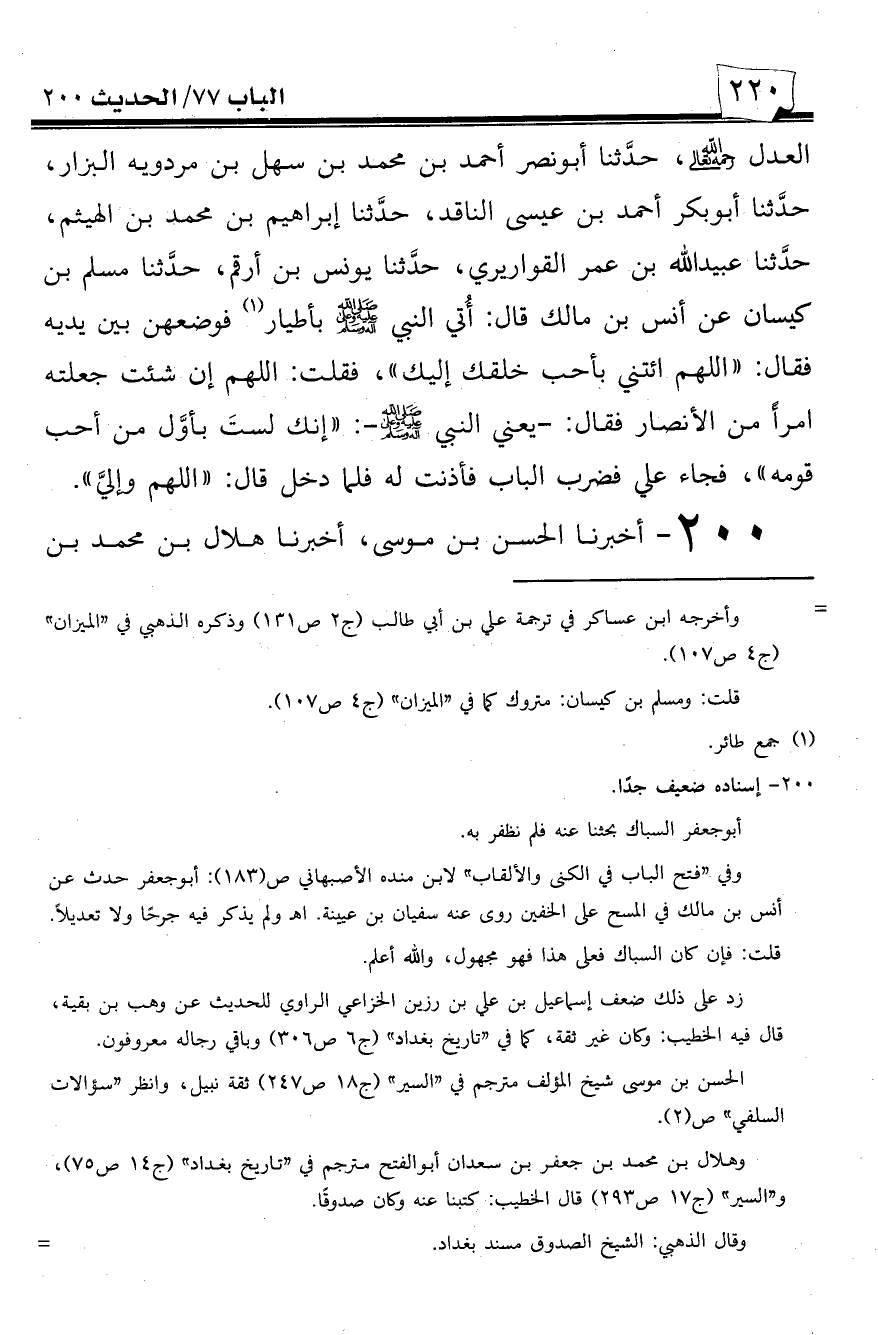 200 - أخبرنا الحسن بن موسى، أخبرنا هلال بن محمد بن -[221]- جعفر بن سعدان أبو الفتح، حدثنا إسماعيل بن علي بن رزين بن عثمان بن عبد الرحمن بن عبد الله بن بديل بن ورقاء الخزاعي البزار بحران، حدثنا وهب بن بقية عن أبي جعفر السباك عن أنس بن مالك قال: أهدي لرسول الله صلى الله عليه وسلم طائر مشوي أهدته له امرأة من الأنصار، فدخل رسول الله صلى الله عليه وسلم فوضعت ذلك بين يديه فقال: ((اللهم أدخل علي أحب خلقك إليك من الأولين والآخرين ليأكل معي من هذا الطائر)) قال أنس: فقلت في نفسي: اللهم اجعله رجلاً من الأنصار من قومي، فجاء علي فطرق الباب! فرددته وقلت: رسول الله صلى الله عليه وسلم متشاغل، ولم يعلم رسول الله صلى الله عليه وسلم بذلك! فقال: ((اللهم أدخل علي أحب خلقك إليك من الأولين والآخرين يأكل معي من هذا الطائر)) قلت: اللهم اجعله رجلاً من قومي الأنصار، فجاء علي فرددته، فلما جاء الثالثة! قال لي رسول الله صلى الله عليه وسلم: ((قم فافتح الباب لعلي))، فقمت ففتحت الباب فأكل معه فكانت الدعوة له.