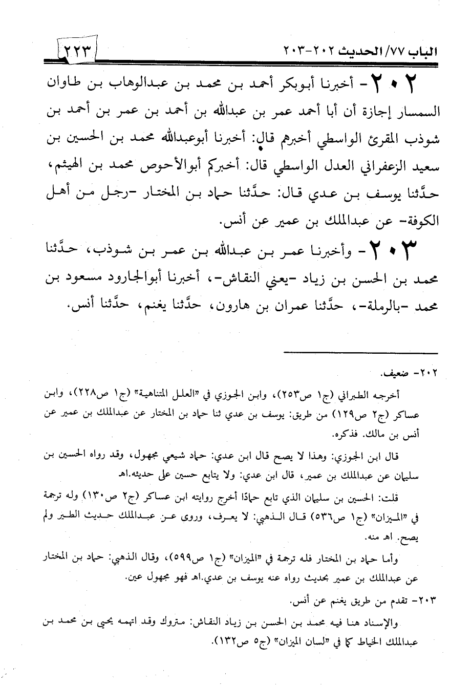 202 - أخبرنا أبو بكر أحمد بن محمد بن عبد الوهاب بن طاوان السمسار إجازة أن أبا أحمد عمر بن عبد الله بن أحمد بن عمر بن أحمد بن شوذب المقرئ الواسطي أخبرهم قال: أخبرنا أبو عبد الله محمد بن الحسين بن سعيد الزعفراني العدل الواسطي قال: أخبركم أبو الأحوص محمد بن الهيثم، حدثنا يوسف بن عدي قال: حدثنا حماد بن المختار -رجل من أهل الكوفة- عن عبد الملك بن عمير عن أنس.