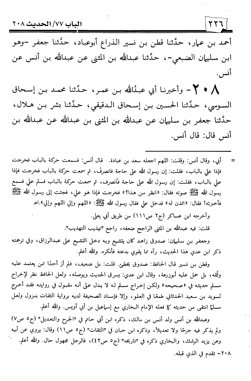 208 - وأخبرنا أبي عبد الله بن عمر، حدثنا محمد بن إسحاق السوسي، حدثنا الحسين بن إسحاق الدقيقي، حدثنا بشر بن هلال، حدثنا جعفر بن سليمان عن عبد الله بن المثنى بن عبد الله عن عبد الله بن أنس قال: قال أنس.