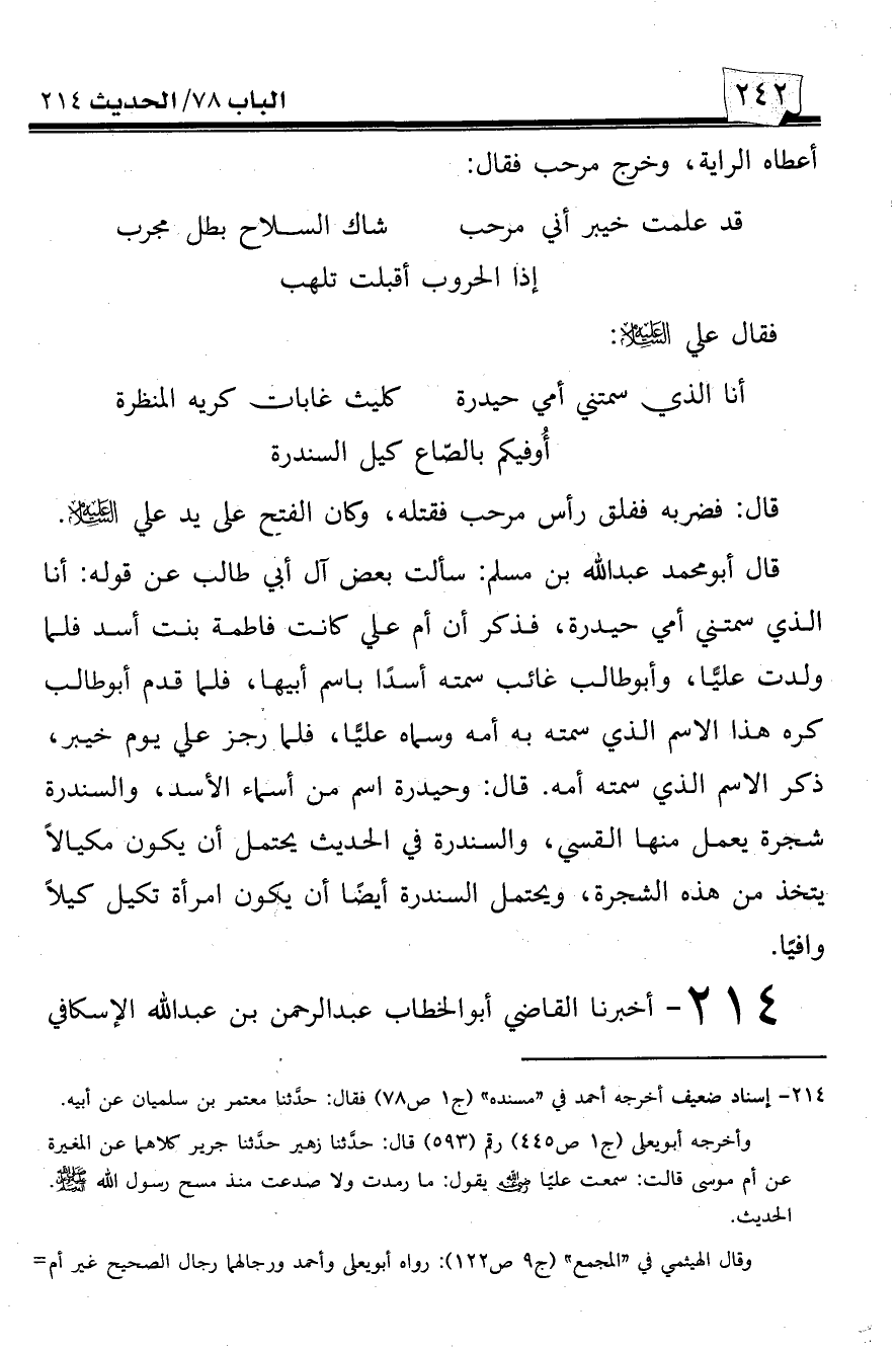 214 - أخبرنا القاضي أبو الخطاب عبد الرحمن بن عبد الله الإسكافي -[243]- الشافعي قدم علينا واسطاً، أخبرنا عبد الله بن عبد الله بن يحيى، حدثنا أبو عبد الله الحسين بن محمد المحاملي، حدثنا يوسف، حدثنا جرير عن المغيرة، عن أم موسى قالت: سمعت علياً عليه السلام يقول: ما رمدت ولا صدعت منذ مسح رسول الله وجهي وتفل في عيني يوم خيبر، وأعطاني الراية.