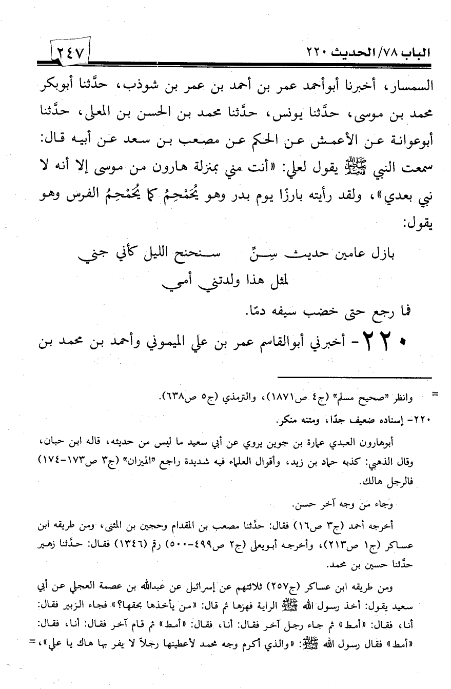 220 - أخبرني أبو القاسم عمر بن علي الميموني وأحمد بن محمد بن -[248]- عبد الوهاب بن طاوان الواسطيان -بقراءتي عليهما فأقرا به- أن أبا إسحاق إبراهيم بن أحمد بن محمد الطبري أجاز لهما قال: حدثنا عبد الله بن إبراهيم، حدثنا الحسن بن عليل قال: حدثني محمد بن عبد الرحمن الذارع، حدثنا قيس بن حفص الدارمي، حدثنا علي بن الحسن العبدي عن أبي هارون عن أبي سعيد الخدري قال: قال رسول الله صلى الله عليه وسلم حيث كان أرسل عمر بن الخطاب إلى خيبر فانهزم هو ومن معه، فرجعوا إلى رسول الله صلى الله عليه وسلم، فبات تلك الليلة وبه من الغم غير قليل. فلما أصبح خرج إلى الناس ومعه الراية فقال: ((لأعطين الراية رجلاً يحب الله ورسوله ويحبه الله ورسوله، غير فرار))، فعرض لها جميع المهاجرين والأنصار، فقال رسول الله صلى الله عليه وسلم: ((أين علي؟)) حيث فقده، فقالوا: يا رسول الله هو أرمد، فأرسل إليه أبا ذر وسلمان فجاءه وهو يقاد لا يقدر على أن يفتح عينيه، ثم قال: ((اللهم أذهب عنه الرمد، والحر، والبرد، وانصره على عدوه، وافتح عليه فإنه عبدك ويحبك ويحب رسولك غير فرار))، ثم دفع الراية إليه فاستأذنه حسان بن ثابت في أن يقول فيه شعراً فقال له: قل! فأنشأ يقول: