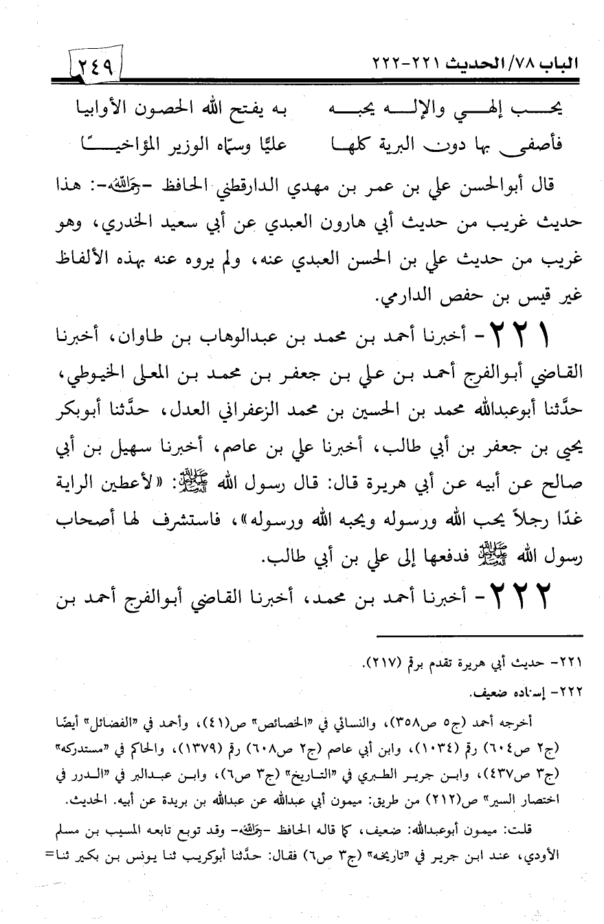 221 - أخبرنا أحمد بن محمد بن عبد الوهاب بن طاوان، أخبرنا القاضي أبو الفرج أحمد بن علي بن جعفر بن محمد بن المعلى الخيوطي، حدثنا أبو عبد الله محمد بن الحسين بن محمد الزعفراني العدل، حدثنا أبو بكر يحيى بن جعفر بن أبي طالب، أخبرنا علي بن عاصم، أخبرنا سهيل بن أبي صالح عن أبيه عن أبي هريرة قال: قال رسول الله صلى الله عليه وسلم: ((لأعطين الراية غداً رجلاً يحب الله ورسوله ويحبه الله ورسوله))، فاستشرف لها أصحاب رسول الله صلى الله عليه وسلم فدفعها إلى علي بن أبي طالب.