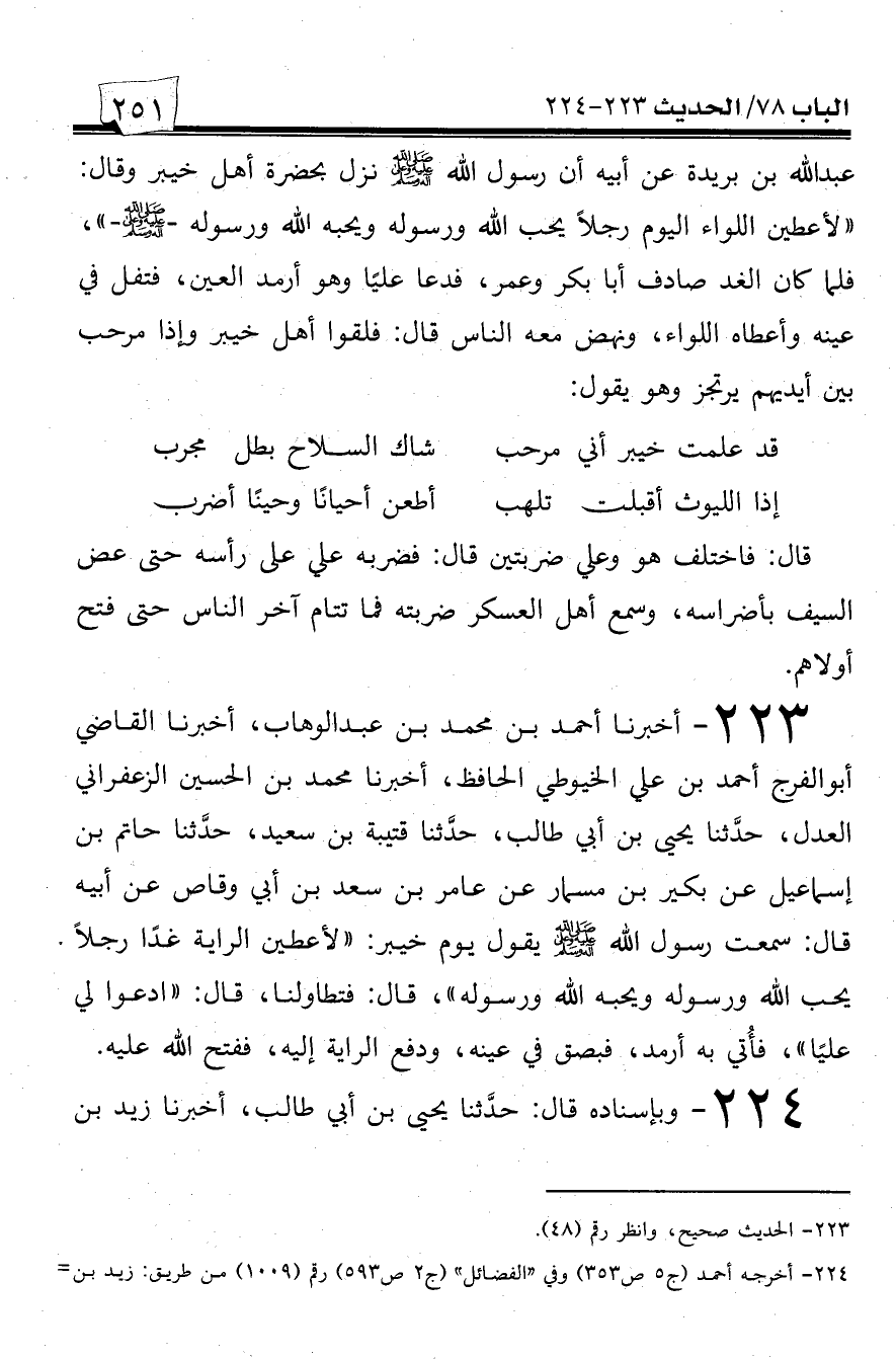 224 - وبإسناده قال: حدثنا يحيى بن أبي طالب، أخبرنا زيد بن -[252]- الحباب، حدثنا حسين بن واقد عن عبد الله بن بريدة عن أبيه قال: لما كان يوم خيبر أخذ أبو بكر اللواء، فلما كان الغد أخذه عمر فقتل محمود بن مسلمة فقال رسول الله صلى الله عليه وسلم: ((لأدفعن الراية إلى رجل لا يرجع حتى يفتح الله عليه))، فصلى رسول الله صلى الله عليه وسلم صلاة الغداة، ثم دعا باللواء، ودعا علياً وهو يشتكي عينه، فمسحها، ثم دفع إليه اللواء فافتتح له، فسمعت عبد الله يقول: حدثني أبي أنه كان صاحب مرحب ... الحديث.