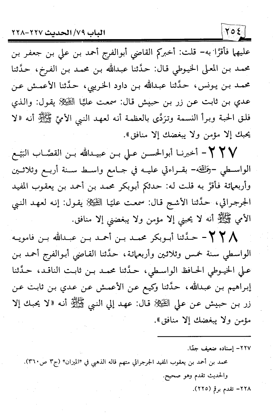 228 - حدثنا أبو بكر محمد بن أحمد بن عبد الله بن فامويه الواسطي سنة خمس وثلاثين وأربعمائة، حدثنا القاضي أبو الفرج أحمد بن علي الخيوطي الحافظ الواسطي، حدثنا محمد بن ثابت الناقد، حدثنا إبراهيم بن عبد الله، حدثنا وكيع عن الأعمش عن عدي بن ثابت عن زر بن حبيش عن علي عليه السلام قال: عهد إلي النبي صلى الله عليه وسلم أنه ((لا يحبك إلا مؤمن ولا يبغضك إلا منافق)).
