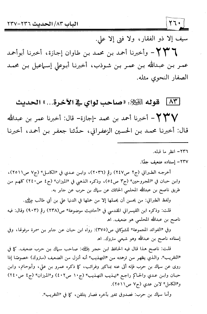 237 - أخبرنا أحمد بن محمد -إجازة- قال: أخبرنا عمر بن عبد الله قال: أخبرنا محمد بن الحسين الزعفراني، حدثنا جعفر بن أحمد، أخبرنا -[261]- عبد الأعلى بن واصل، حدثنا إسماعيل بن أبان، حدثنا ناصح أبو عبد الله المحلمي عن سماك بن حرب عن جابر بن سمرة قال: قيل: يا رسول الله من صاحب لواك في الآخرة؟ قال: ((صاحب لواي في الدنيا علي بن أبي طالب)).