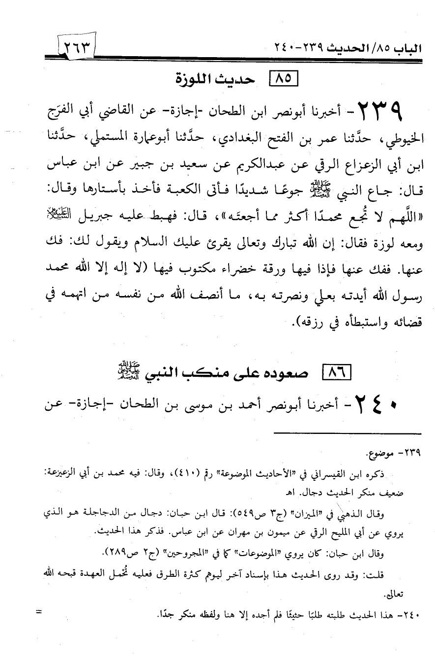 239 - أخبرنا أبو نصر ابن الطحان -إجازة- عن القاضي أبي الفرج الخيوطي، حدثنا عمر بن الفتح البغدادي، حدثنا أبو عمارة المستملي، حدثنا ابن أبي الزعزاع الرقي عن عبد الكريم عن سعيد بن جبير عن ابن عباس قال: جاع النبي صلى الله عليه وسلم جوعاً شديداً فأتى الكعبة فأخذ بأستارها وقال: ((اللهم لا تجع محمداً أكثر مما أجعته))، قال: فهبط عليه جبريل عليه السلام ومعه لوزة فقال: إن الله تبارك وتعالى يقرئ عليك السلام ويقول لك: ففك عنها فإذا فيها ورقة خضراء مكتوب فيها (لا إله إلا الله محمد رسول الله أيدته بعلي ونصرته به، ما أنصف الله من نفسه من اتهمه في قضائه واستبطأه في رزقه).