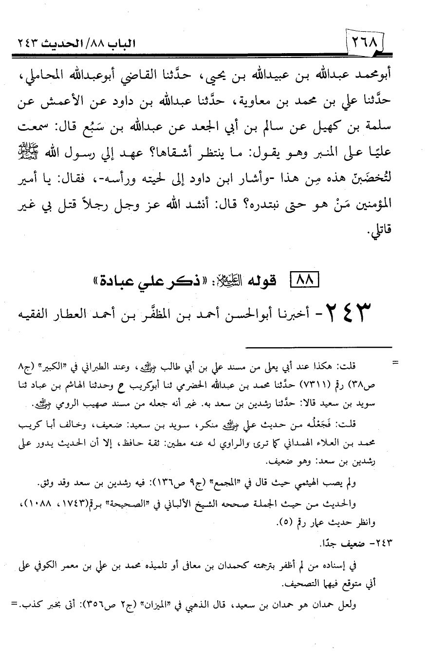 243 - أخبرنا أبو الحسن أحمد بن المظفر بن أحمد العطار الفقيه -[269]- الشافعي -رضي الله عنه- بقراءتي عليه فأقر به قلت: أخبركم أبو محمد عبد الله بن محمد بن عثمان المزني الملقب بابن السقاء، الحافظ الواسطي -رحمه الله- قال: حدثني محمد بن علي بن معمر الكوفي، حدثنا حمدان بن المعافى، حدثنا وكيع عن هشام بن عروة عن أبيه عن عائشة قالت: قال رسول الله صلى الله عليه وسلم: ((ذكر علي عبادة)).