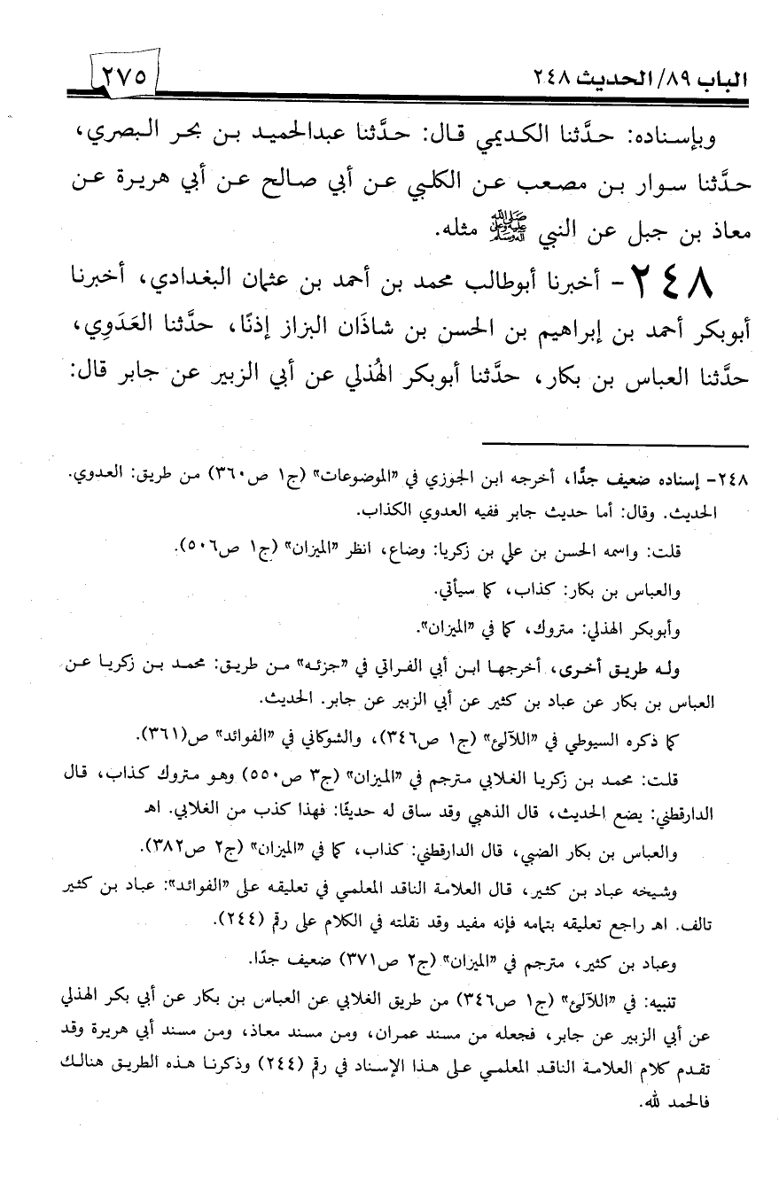 248 - أخبرنا أبو طالب محمد بن أحمد بن عثمان البغدادي، أخبرنا أبو بكر أحمد بن إبراهيم بن الحسن بن شاذان الزاز إذناً، حدثنا العدوي، حدثنا العباس بن بكار، حدثنا أبو بكر الهذلي عن أبي الزبير عن جابر قال: -[276]- قال رسول الله صلى الله عليه وسلم: ((النظر إلى وجه علي عبادة)).