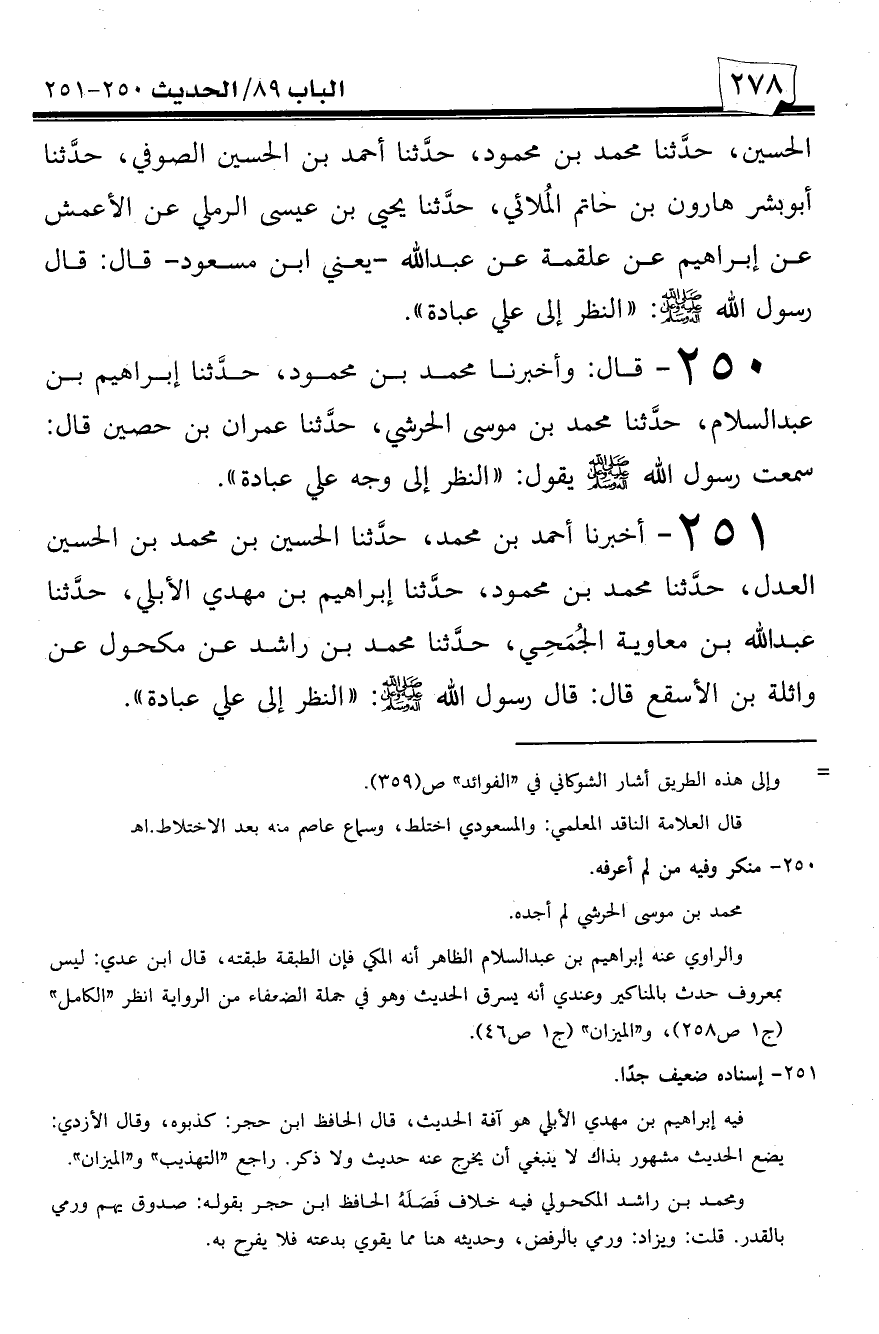250 - قال: وأخبرنا محمد بن محمود، حدثنا إبراهيم بن عبد السلام، حدثنا محمد بن موسى الحرشي، حدثنا عمران بن حصين قال: سمعت رسول الله صلى الله عليه وسلم يقول: ((النظر على وجه علي عبادة)).