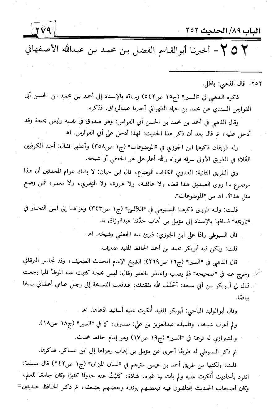 252 - أخبرنا أبو القاسم الفضل بن محمد بن عبد الله الأصفهاني -[280]- قدم علينا واسطاً في شهر رمضان سنة أربع وثلاثين وأربعمائة، حدثنا أبو بكر محمد بن إبراهيم، حدثنا أبو القاسم عبد الله بن إبراهيم، حدثنا أحمد بن محمد، حدثنا محمد بن حماد الطهراني، أخبرنا عبد الرزاق عن معمر عن الزهري عن عروة عن عائشة قالت: رأيت أبا بكر يكثر النظر إلى وجه علي فقلت: يا أبه أراك تكثر النظر إلى وجه علي؟ فقال: يا بنية سمعت رسول الله صلى الله عليه وسلم يقول: ((النظر على وجه علي عبادة)).